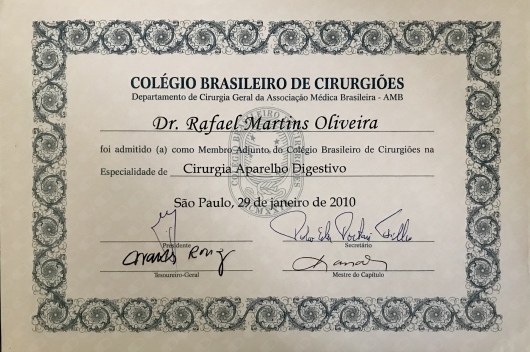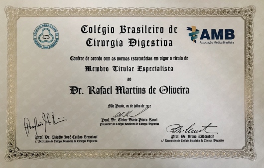Quais são as principais especialidades de Rafael Martins de Oliveira?Rafael Martins de Oliveira é cirurgião geral, coloproctologista, gastroenterologista. Te mostramos alguns dos serviços oferecidos pelo especialista graças à sua trajetória e vasta experiência: Colectomia Total, Hernioplastia Hiatal (Cardioplastia) Videolaparoscopica, Gastrectomia Total, Herniorrafia Inguinal Videolaparoscopica, Herniorrafia Inguinal (Unilateral), Colecistectomia videolaparoscopica, Herniorrafia Incisional, Herniorrafia Epigastrica, Herniorrafia Umbilical, Colecistectomia.