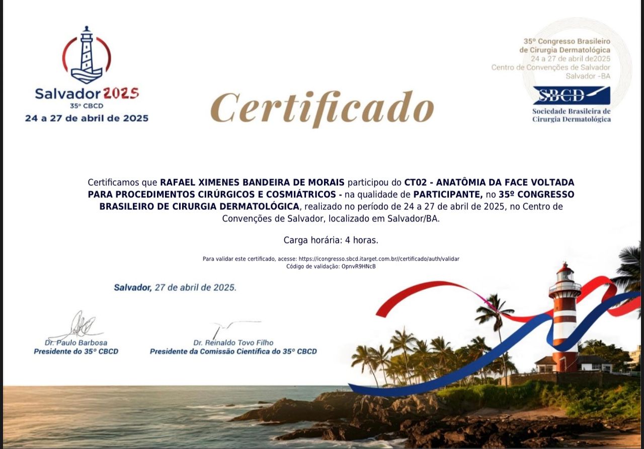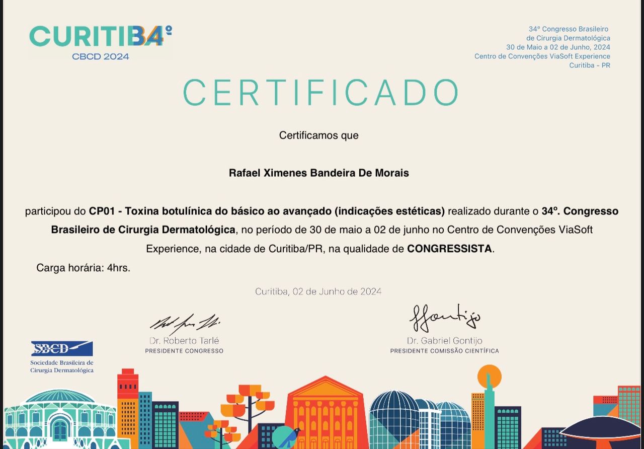 Quais são as principais especialidades de Rafael Ximenes Bandeira de Morais .?Rafael Ximenes Bandeira de Morais . é dermatologista. Te mostramos alguns dos serviços oferecidos pelo especialista graças à sua trajetória e vasta experiência: Primeira consulta Dermatologia, Consulta Dermatologia, Aplicação da toxina botulínica, Aplicação de Bioestimulador de colágeno, Biópsias, Cirurgia Do Xantelasma, Dermatoscopia digital, Diagnóstico da perda de sobrancelhas, Eletro Coagulacao De Lesao Cutanea, Excisao E Sutura Simples.