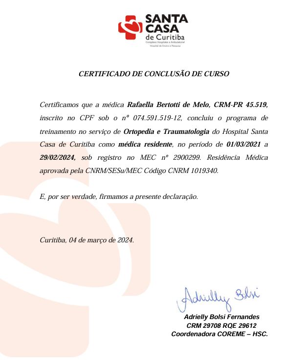 Olá, sou a Dra. Rafaella, Graduada em Medicina pela Universidade Cesumar (2020). Fui membro das ligas acadêmica de Ortopedia e Medicina Esportiva (UEM), Ortopedia e Traumatologia (Unicesumar), Neurociência (Unicesumar). Residência Médica em Ortopedia e Traumatologia no Hospital Santa Casa de Misericórdia de Curitiba (2021-2024), com Título de Especialista obtido pela Sociedade Brasileira de Ortopedia e Traumatologia - SBOT.