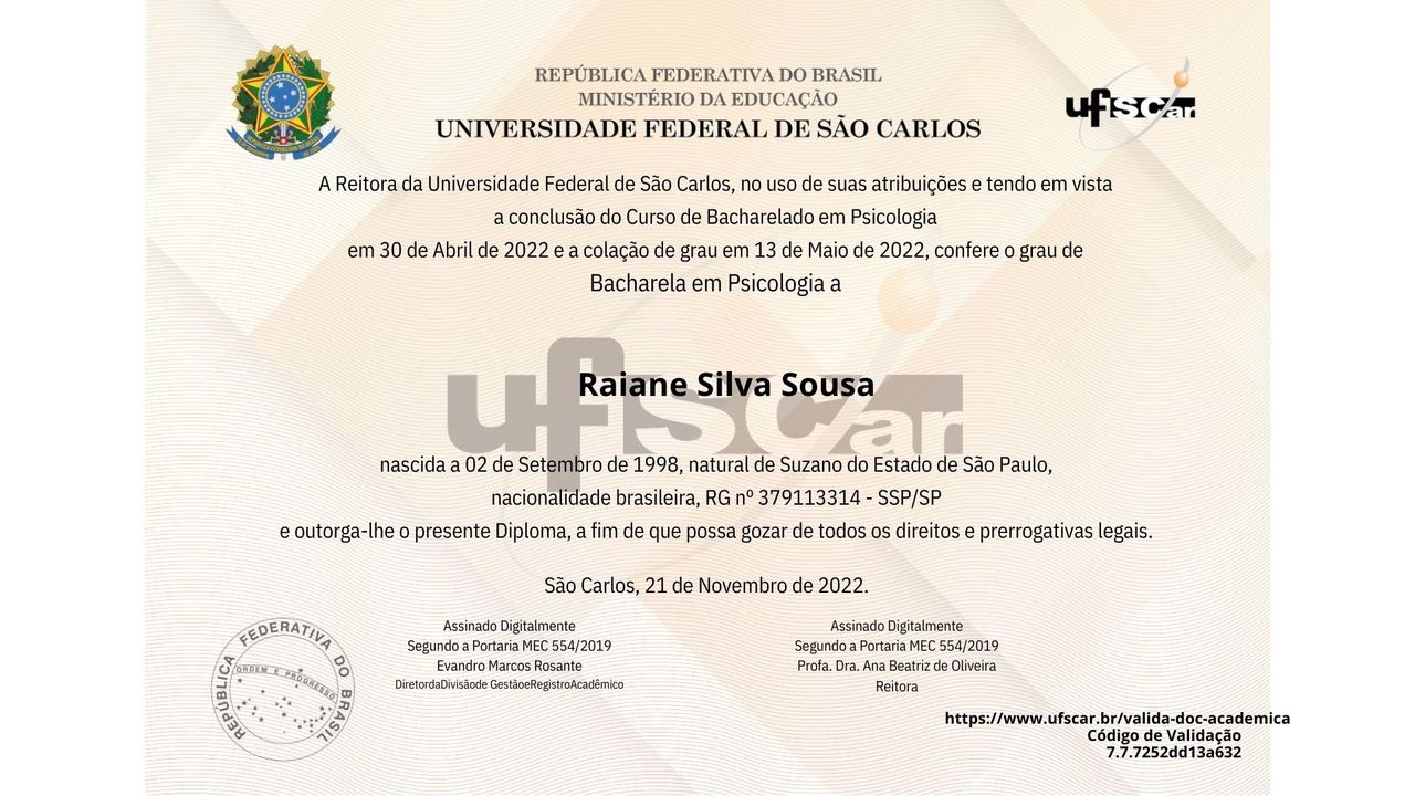 Sou psicóloga (06/182817) formada pela Universidade Federal de São Carlos (UFSCar) e realizo atendimentos online com compromisso ético no cuidado à saúde mental. Ao longo do meu percurso, atuei tanto com atendimentos particulares quanto no SUS, com diferentes níveis de cuidado e públicos. Atualmente, em processo de encerramento na especialização em Psicologia Clínica, para que assim nossos encontros sejam ainda mais qualificados.