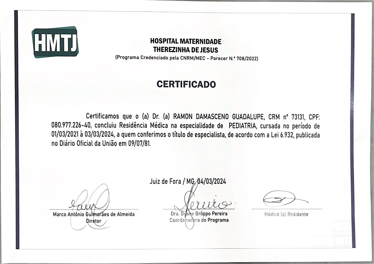 Sou médico pediatra, titulado pela Sociedade Brasileira de Pediatria. Me formei em Medicina pela Faculdade de Medicina de Barbacena (FUNJOBE) e fiz residência médica em Pediatria pelo Hospital e Maternidade Therezinha de Jesus (HMTJ). Concluí a pós-graduação em Emergências Pediátricas pelo Instituto Israelita de Ensino e Pesquisa Albert Einstein e atualmente curso pós-graduação em Gestão em Saúde.