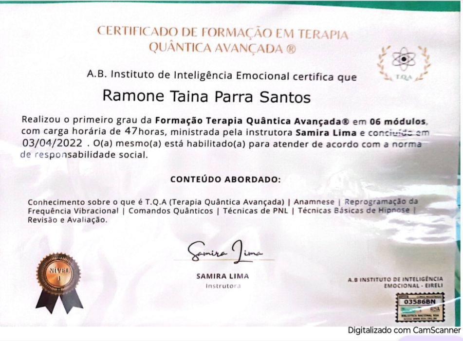 Quais são as principais especialidades de Ramone Santos?Ramone Santos é terapeuta complementar, psicanalista. Te mostramos alguns dos serviços oferecidos pelo especialista graças à sua trajetória e vasta experiência: Primeira consulta Terapias Complementares e Alternativas, Acupuntura, Auriculoterapia, Ventosaterapia, Cromoterapia, Acupuntura à laser, Acesso a Consciência (Access Consciousness), Moxaterapia, Cone hindu, Terapia reiki.