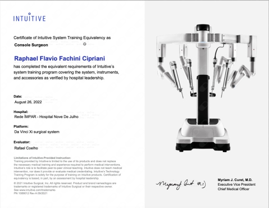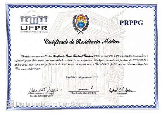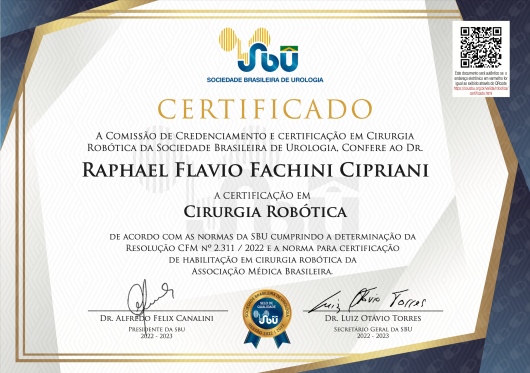 Quais são as principais especialidades de Raphael Fachini Cipriani?Raphael Fachini Cipriani é urologista, cirurgião geral. Te mostramos alguns dos serviços oferecidos pelo especialista graças à sua trajetória e vasta experiência: Teleconsulta, Nefrectomia Parcial Robótica, Nefrectomia parcial por videolaparoscopia, Nefrectomia radical por videolaparoscopia, Consulta urologista, Cistoscopia com biopsia de bexiga, Cistostomia, Cistoscopia, Uretrotomia interna, Cistoscopia e/ou uretrocistoscopia.