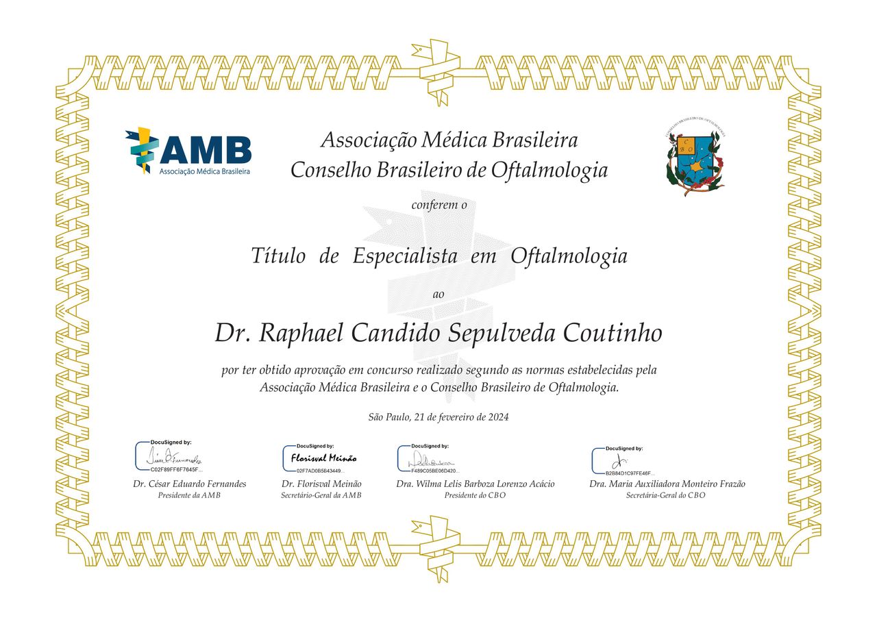 Título de Especialista em Oftalmologia pelo Conselho Brasileiro de Oftalmologia (CBO) / Associação Médica Brasileira (AMB).