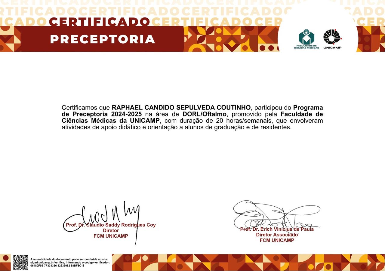 Preceptor do serviço de Oftalmologia do HC-UNICAMP.