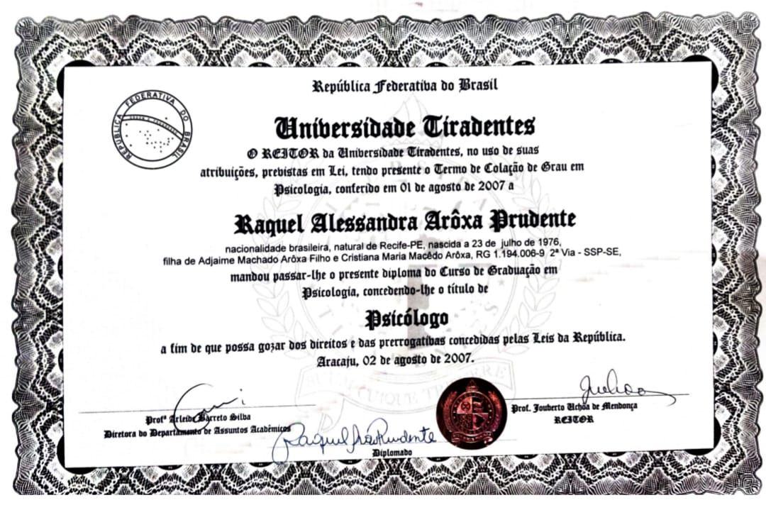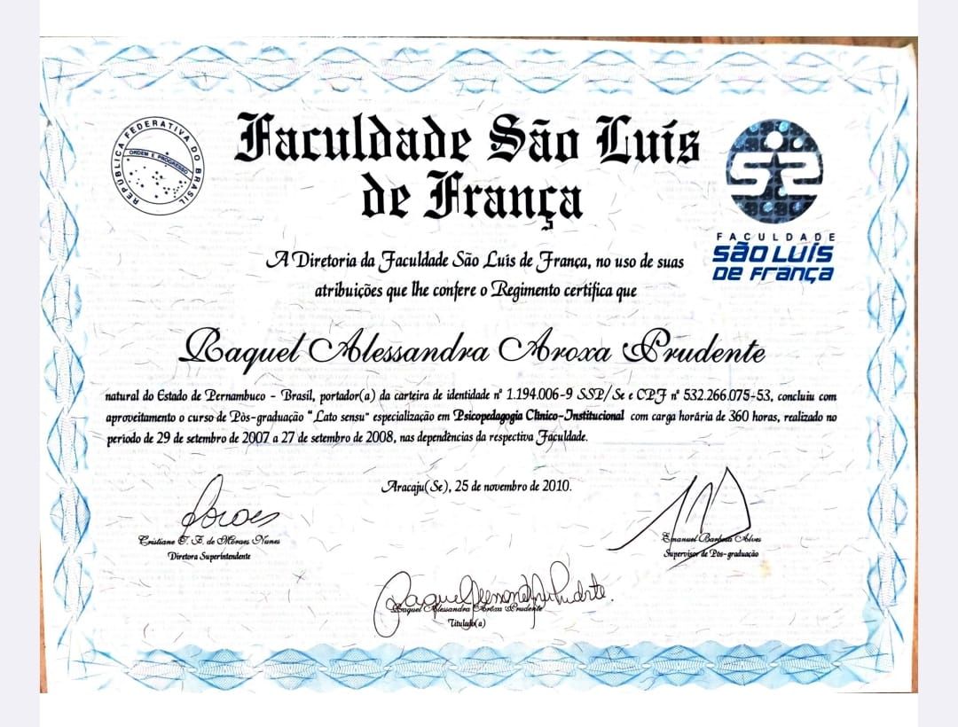 Número de registro: CRP SE 1374 certificado apresentado para Psicopedagogia
