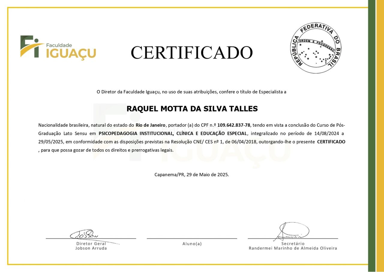 Sou psicopedagoga e acredito que cada pessoa tem seu próprio jeito e ritmo de aprender. Meu trabalho é acolher, compreender e ajudar crianças, adolescentes e adultos a desenvolverem todo o seu potencial — com leveza, empatia e respeito à individualidade de cada um. Na minha prática, procuro criar um ambiente seguro e tranquilo, onde o aprender volte a ser algo natural e prazeroso. A escuta atenta, o olhar cuidadoso e o vínculo de confiança são parte essencial desse processo.
