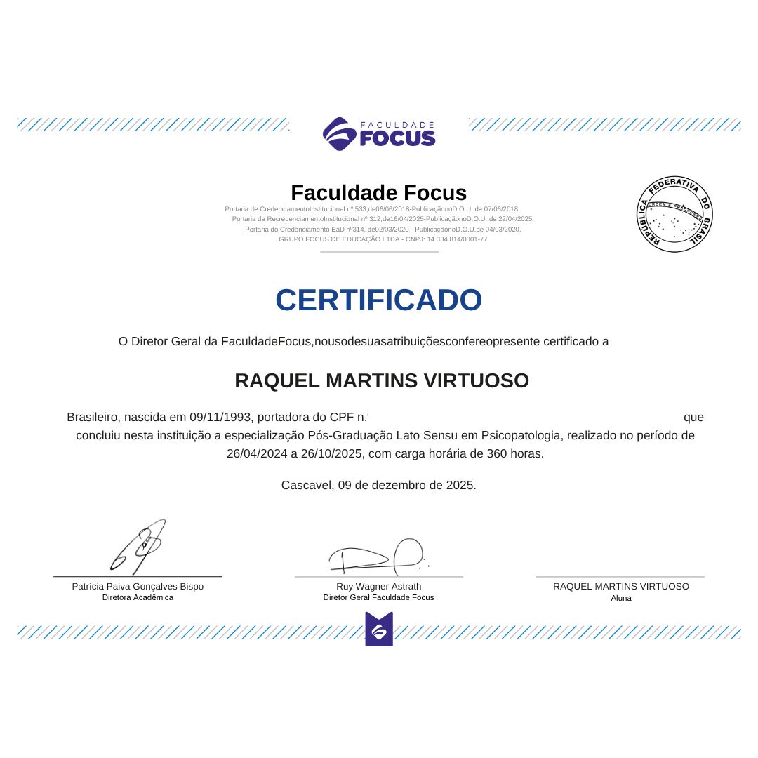A Raquel é uma profissional ímpar e extremamente dedicada. Foi responsável por quebrar todas as minhas barreiras em relação à terapia! Com firmeza e bastante sensibilidade, com ela pude criar um vínculo de confiança. Ela segura na minha mão e me conduz às reflexões necessárias ao longo do caminho do autoconhecimento, fazendo com que eu seja a protagonista do meu próprio cuidado. Minha evolução em menos de um ano de acompanhamento é evidente. Além de uma abordagem sólida, baseada em evidências e na ciência, é um ser humano raro, com escuta ativa e muito carinho. Sinto-me profundamente acolhida e, hoje, mais capaz de compreender minhas vivências e comportamentos.