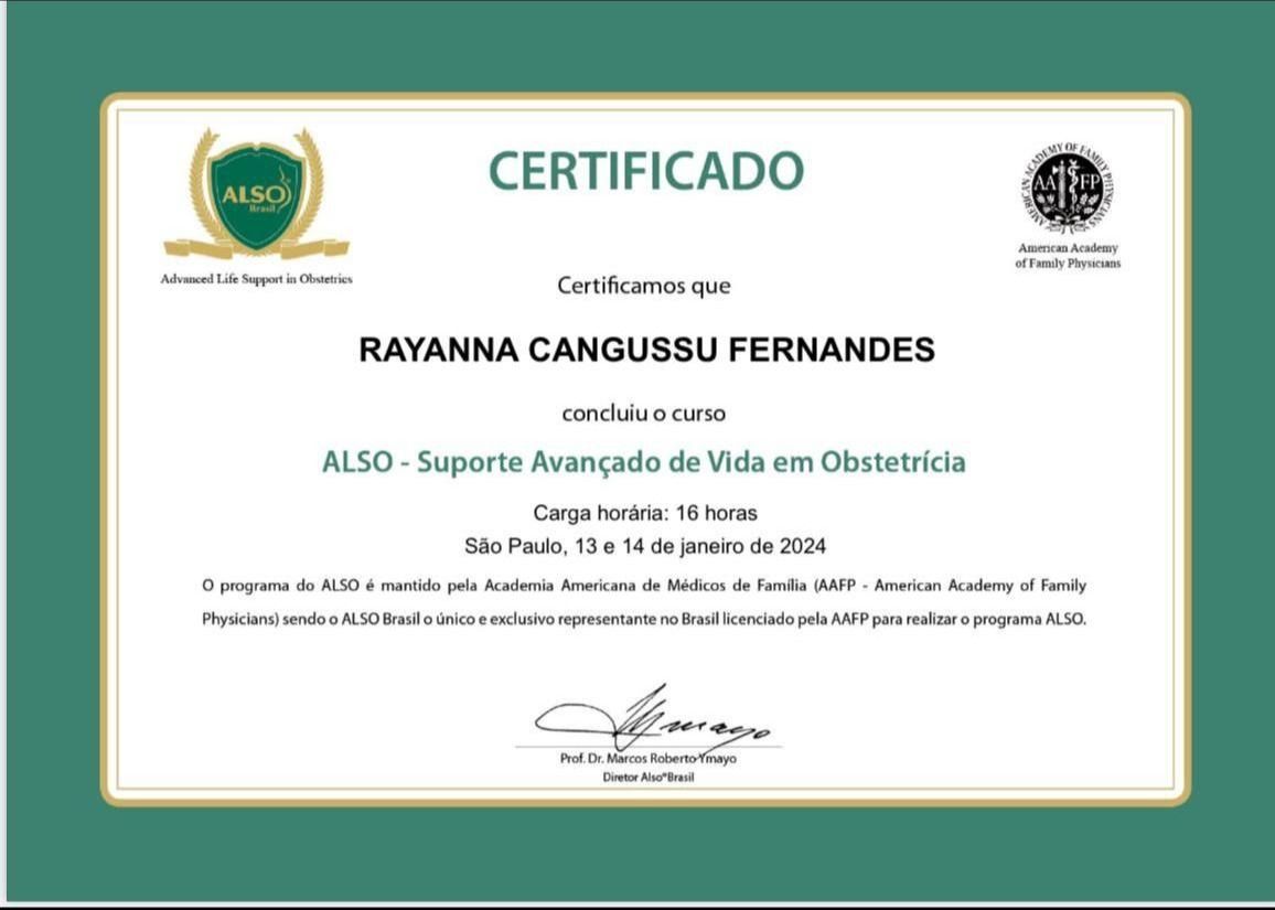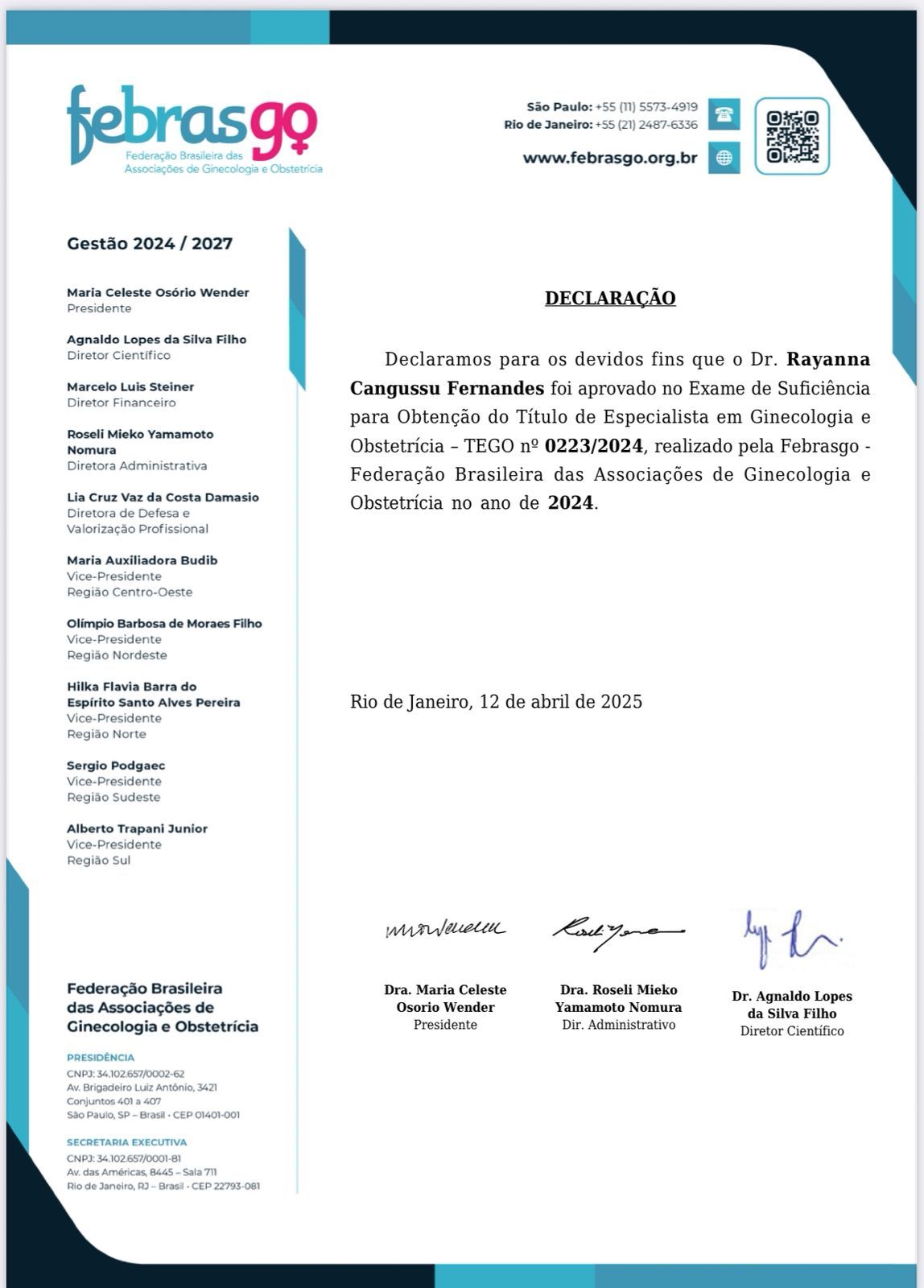 Possuo título de especialista em Ginecologia e Obstetrícia (TEGO) pela Federação Brasileira das Associações de Ginecologia e Obstetrícia.