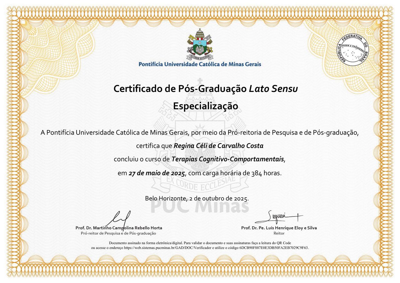 Hoje, sou psicóloga clínica, especialista em Terapia Cognitivo-Comportamental, e me sinto profundamente realizada em acompanhar pessoas em seus processos de mudança, autoconhecimento e superação.