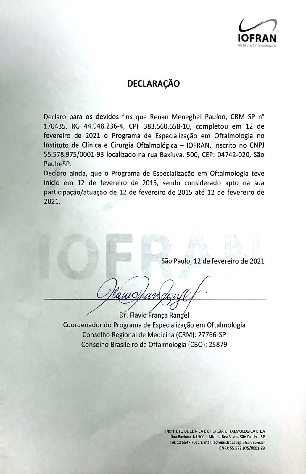Quais são as principais especialidades de Renan Meneghel Paulon?Renan Meneghel Paulon é oftalmologista. Te mostramos alguns dos serviços oferecidos pelo especialista graças à sua trajetória e vasta experiência: Retinografia, Adaptação de Lente de Contato, Retorno de consultas Oftalmologia, Biopsia da esclera, Oftalmoscopia, Injeção intraocular antiangiogênico (Lucentis, Eylia, Avastin), Exérese de calazio, Biopsia Da Cornea, Gonioscopia, Epilação de cilios.
