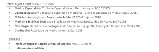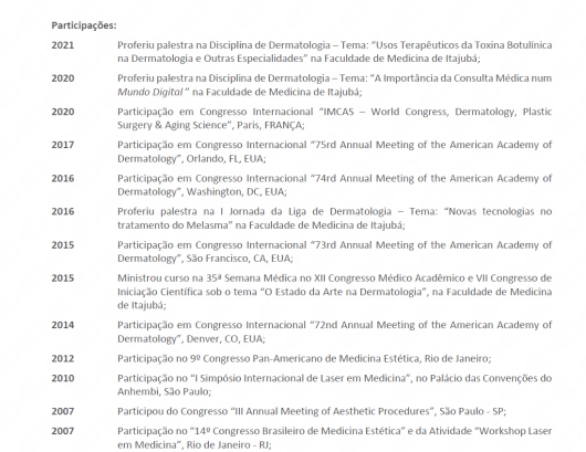 Atualmente foco em tratamentos estruturados relacionados a Harmonização Facial, Corporal, Lasers, Rejuvenescimento, Cosmiatria, Rugas, Alopécias, Quedas de Cabelo, Peelings e Preenchedores, entre outros;