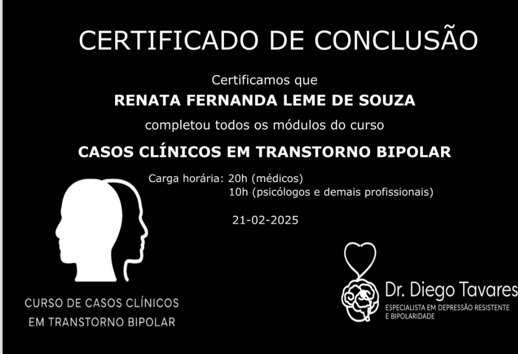 Renata é uma excelente profissional, muito atenciosa e eficiente. Fazer a terapia com ela fez toda a diferença no meu tratamento, pois deste então estou estável.