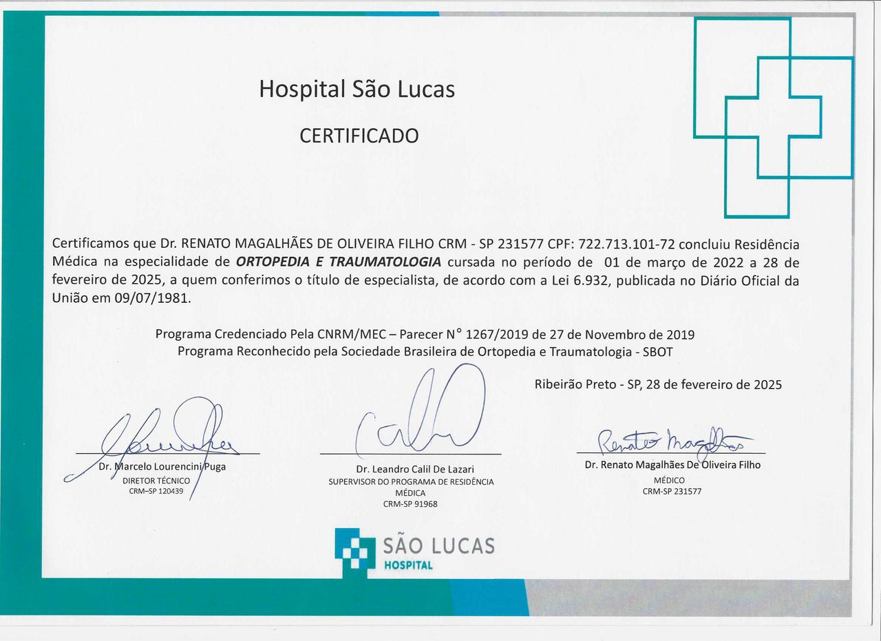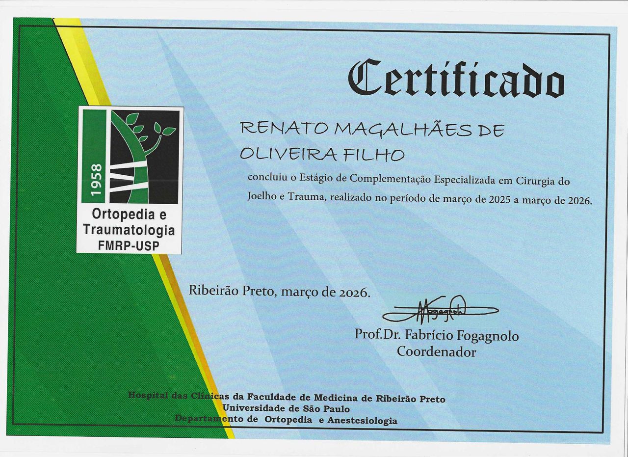 Médico graduado pela Faculdade Alfredo Nasser (2021). Realizou residência médica em Ortopedia e Traumatologia pelo Hospital São Lucas de Ribeirão Preto - SP (2025). Membro titular da Sociedade Brasileira de Ortopedia e Traumatologia (TEOT 20335). Concluiu Complementação Especializada em Cirurgia do Joelho e Trauma pelo Hospital das Clínicas da Faculdade de Medicina de Ribeirão Preto da Universidade de São Paulo (HCFMRP - USP) (2026). Atua na área de ortopedia e traumatologia com ênfase em cirurgia do joelho, trauma ortopédico e lesões esportivas
