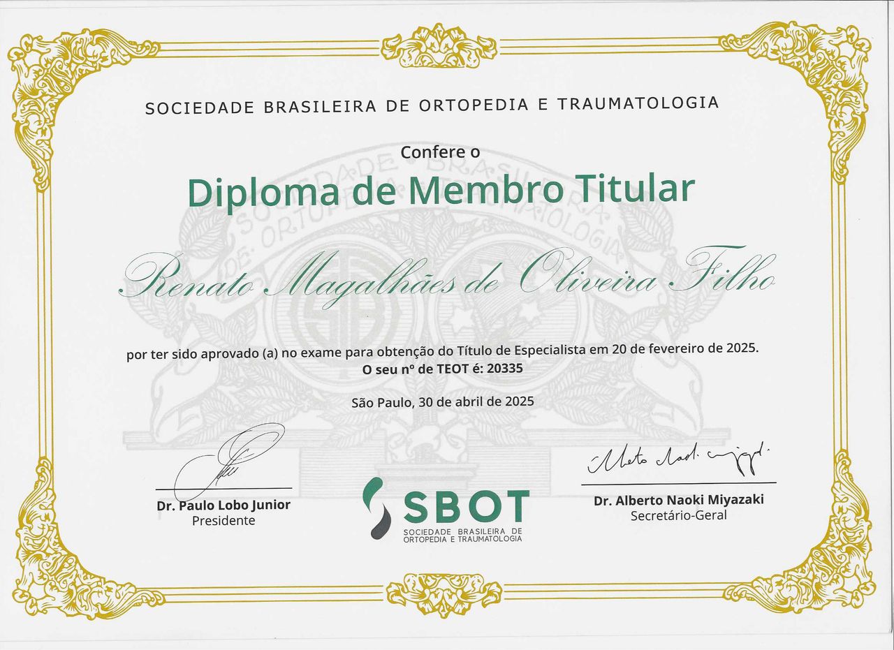 Quais são as principais especialidades de Renato Magalhães de Oliveira Filho?Renato Magalhães de Oliveira Filho é ortopedista - traumatologista. Te mostramos alguns dos serviços oferecidos pelo especialista graças à sua trajetória e vasta experiência: Primeira consulta ortopedia e traumatologia, Densitometria óssea, Consulta particular, Análise da densidade óssea na determinação da osteoporose , Reconstrução ligamentar intra-articular do joelho (Ligamentoplastia), Artroscopia , Infiltração de substâncias em cavidade sinovial (articulação), Retorno de consultas ortopedia e traumatologia, Artroscopia Cirurgica Do Joelho, Viscossuplementação.