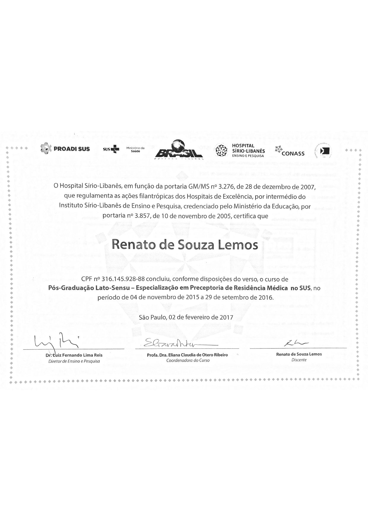 Posso passar por atendimento online com Renato Souza Lemos, sem ter que ir até o consultório?Sim, Renato Souza Lemos oferece atendimento online. Basta selecionar "Teleconsulta" ao agendar sua consulta e você poderá ver as datas e horários disponíveis.