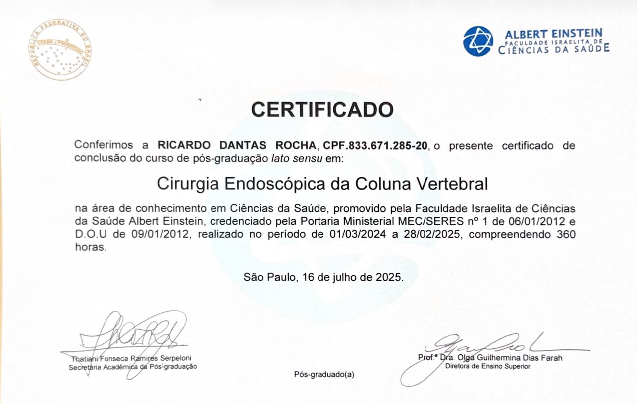 Pós-graduado em Cirurgia Endoscópica da Coluna pelo Hospital Israelita Albert Einstein.