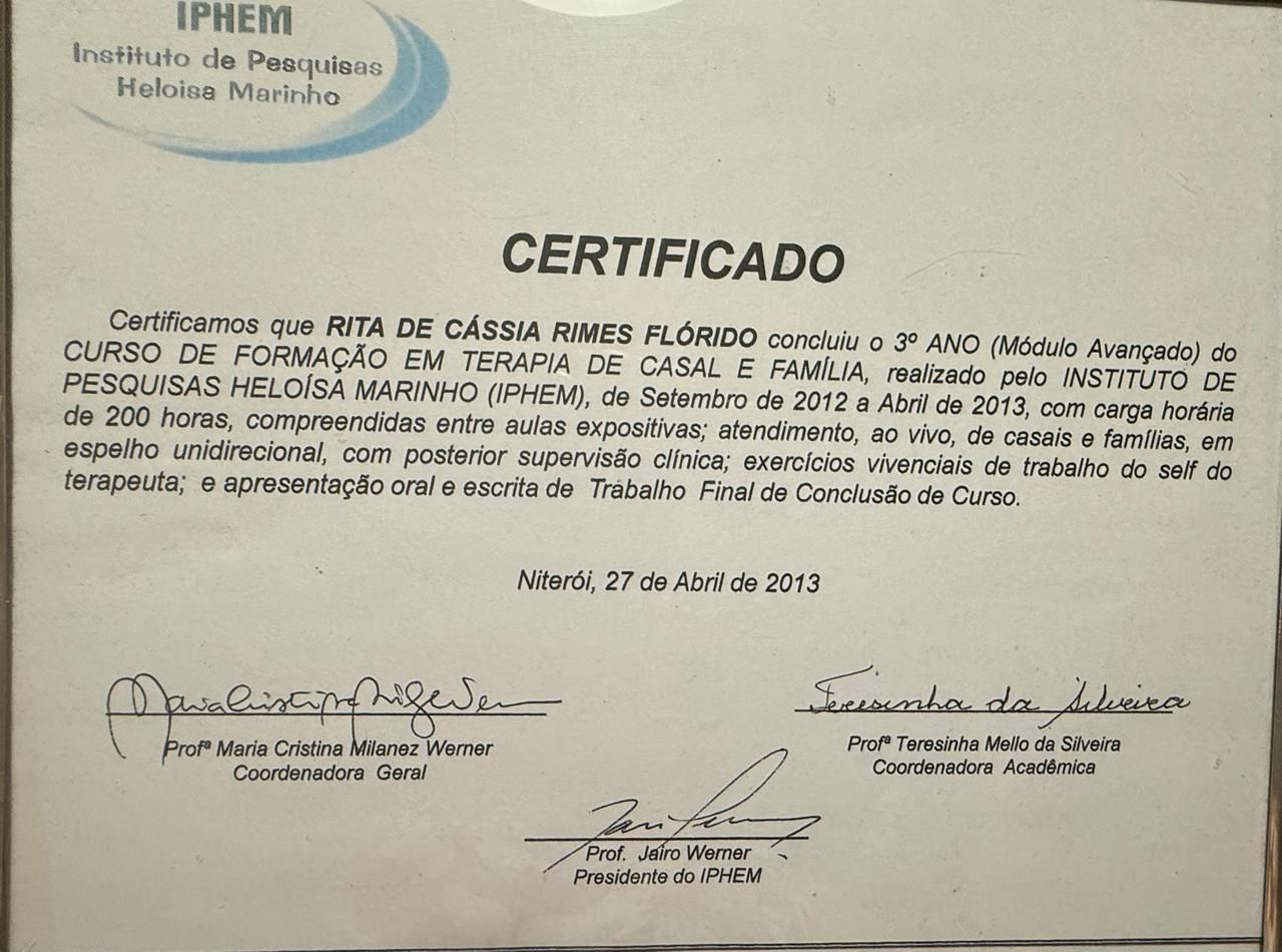 Posso passar por atendimento online com Rita de Cássia Rimes Flórido, sem ter que ir até o consultório?Sim, Rita de Cássia Rimes Flórido oferece atendimento online. Basta selecionar "Teleconsulta" ao agendar sua consulta e você poderá ver as datas e horários disponíveis.