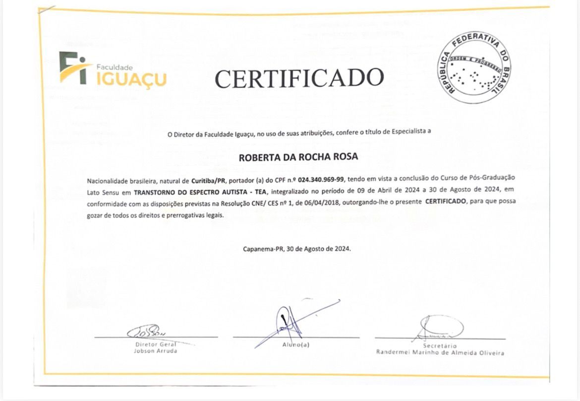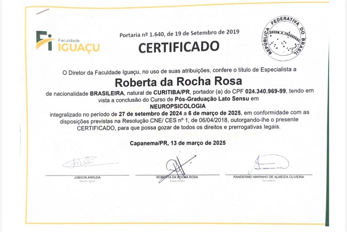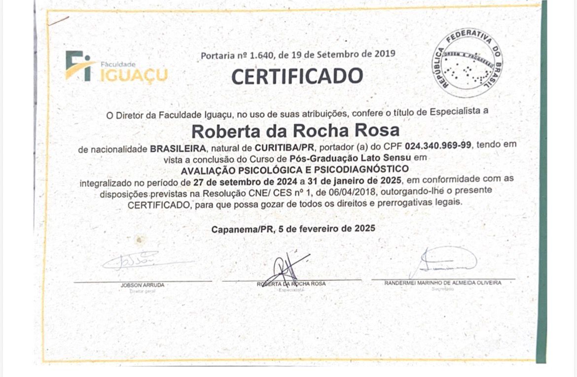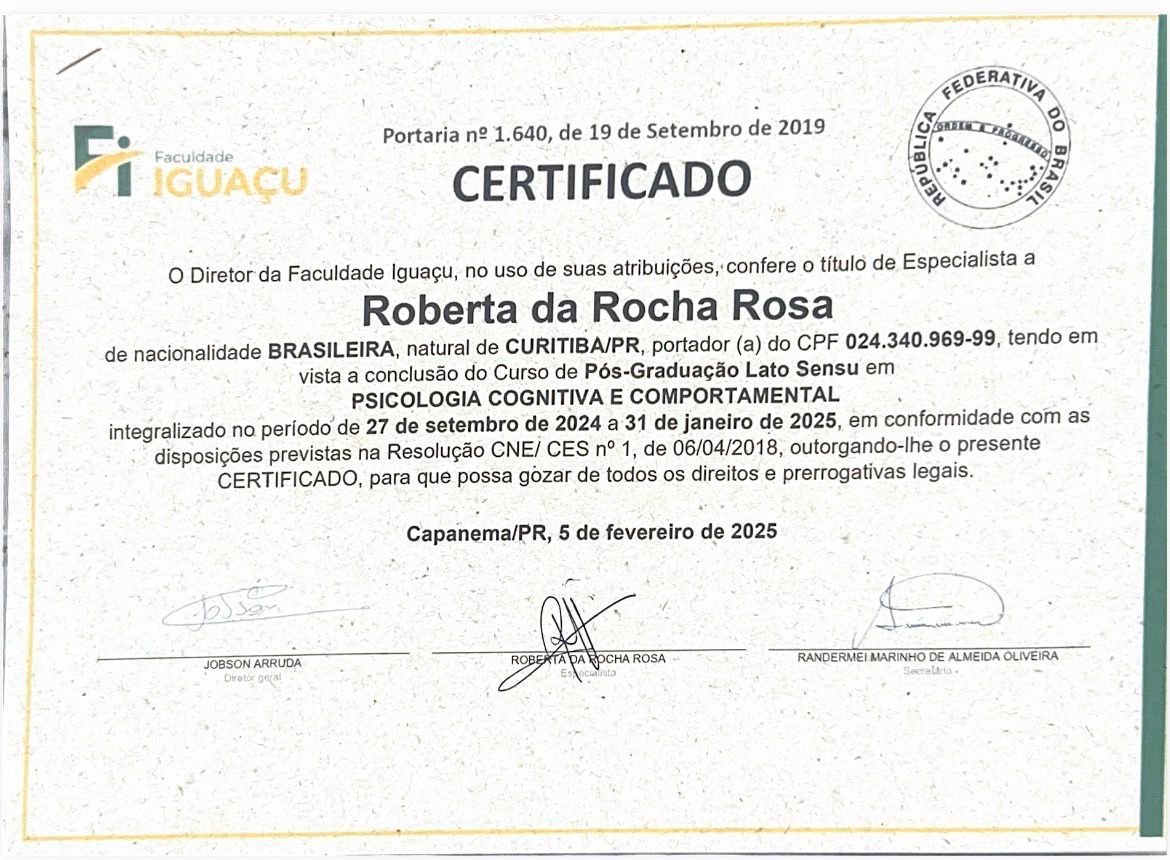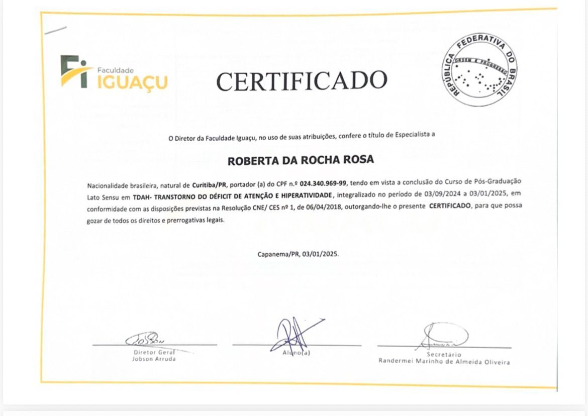Meu nome é Roberta da Rocha Rosa, CRP 08/41064. Atuo com a abordagem sistêmica (familiar) e Teoria Cognitivo Comportamental, em todas as idades e com neurodivergências em geral, como TEA, TDAH e TOD.