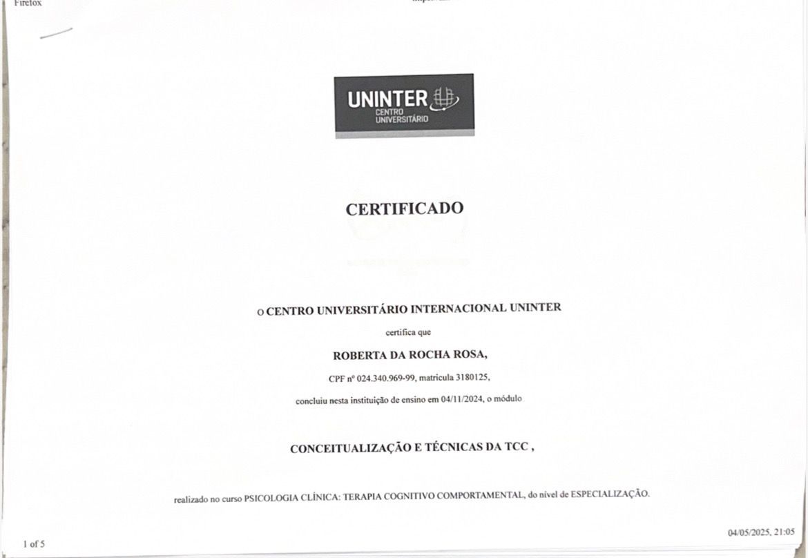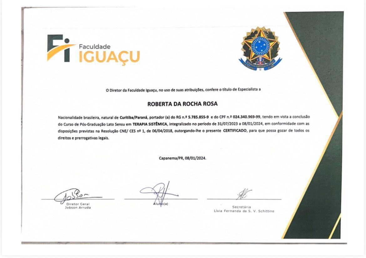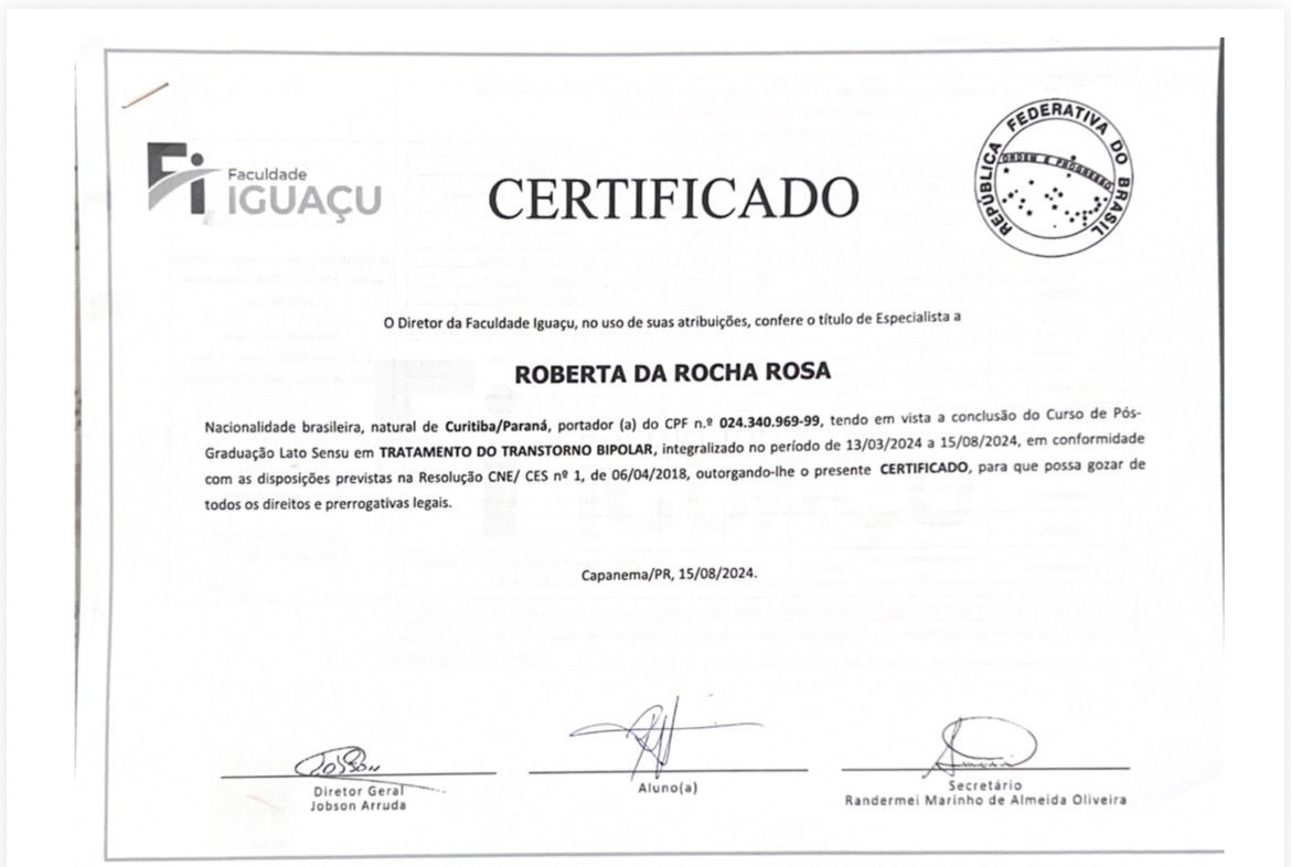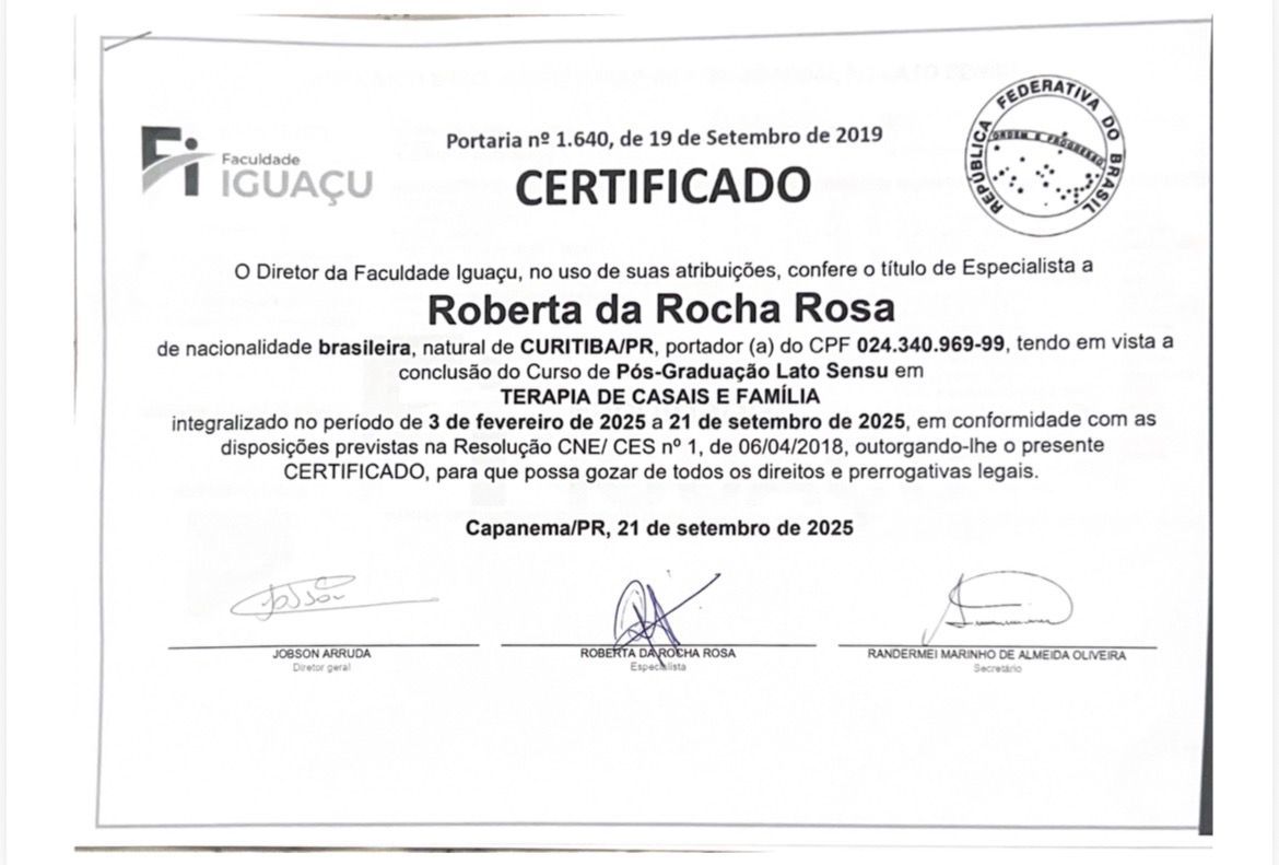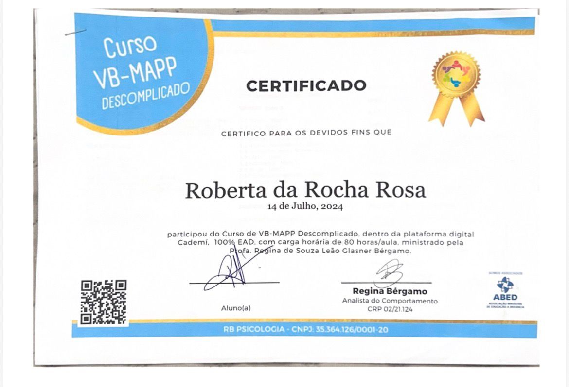 Meu nome é Roberta da Rocha Rosa, CRP 08/41064. Atuo com a abordagem sistêmica (familiar) e Teoria Cognitivo Comportamental, em todas as idades e com neurodivergências em geral, como TEA, TDAH e TOD.