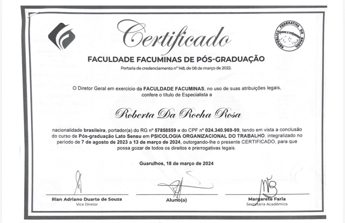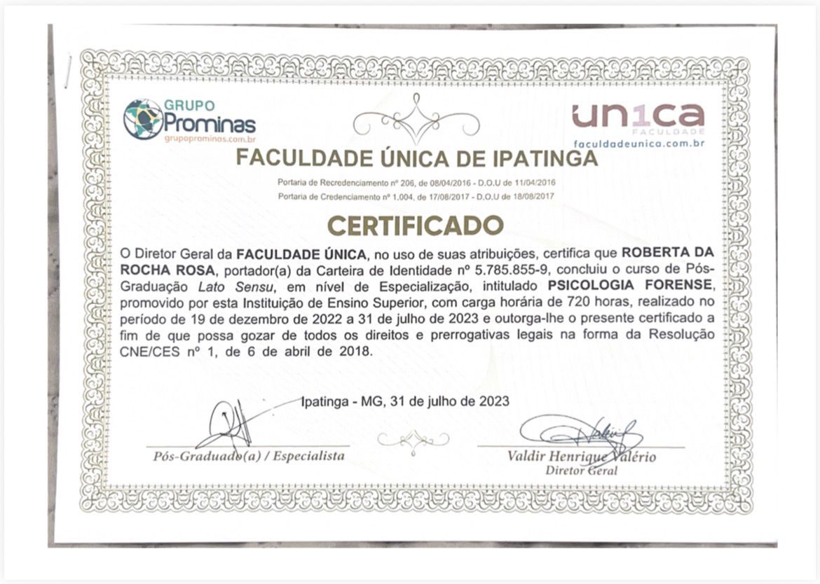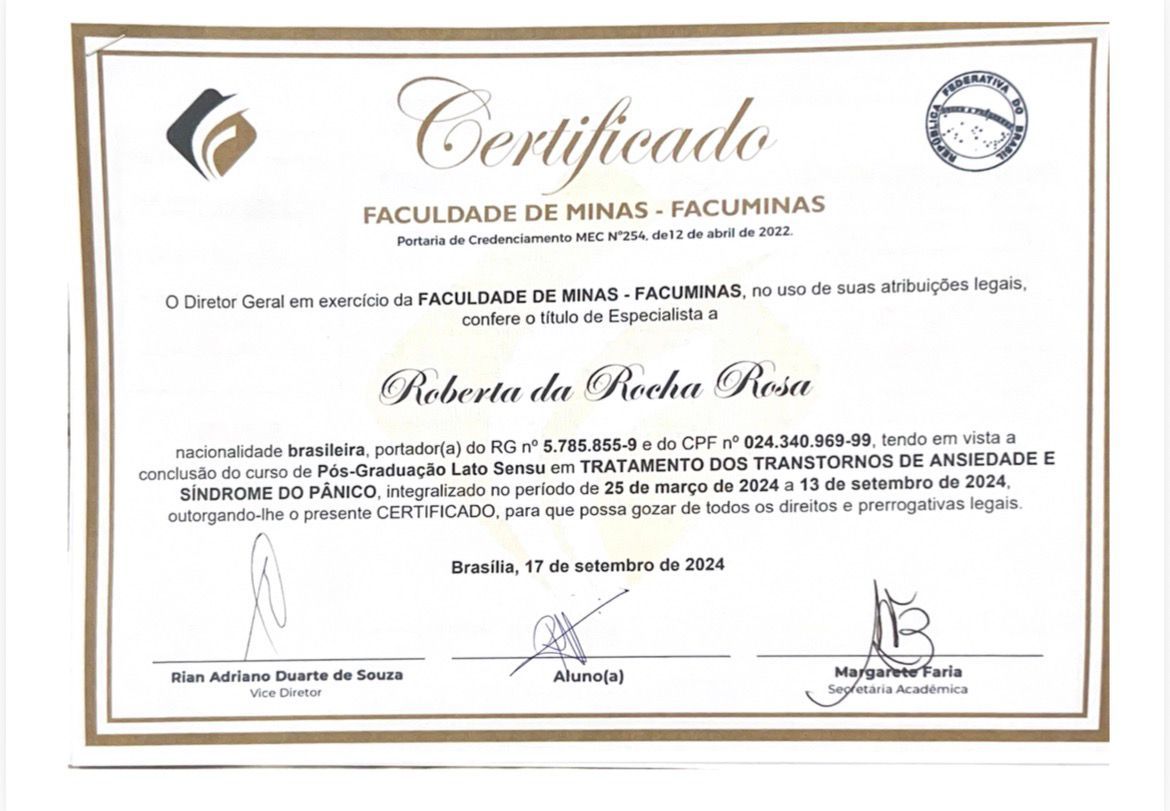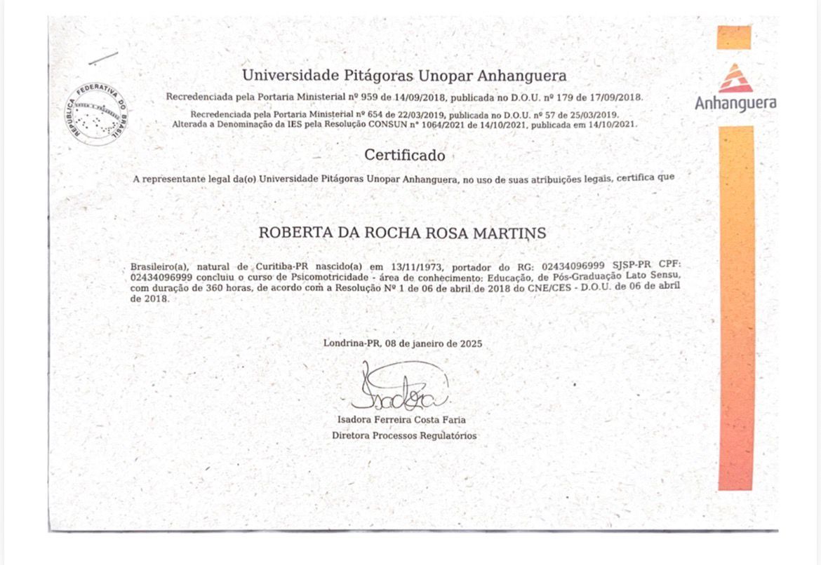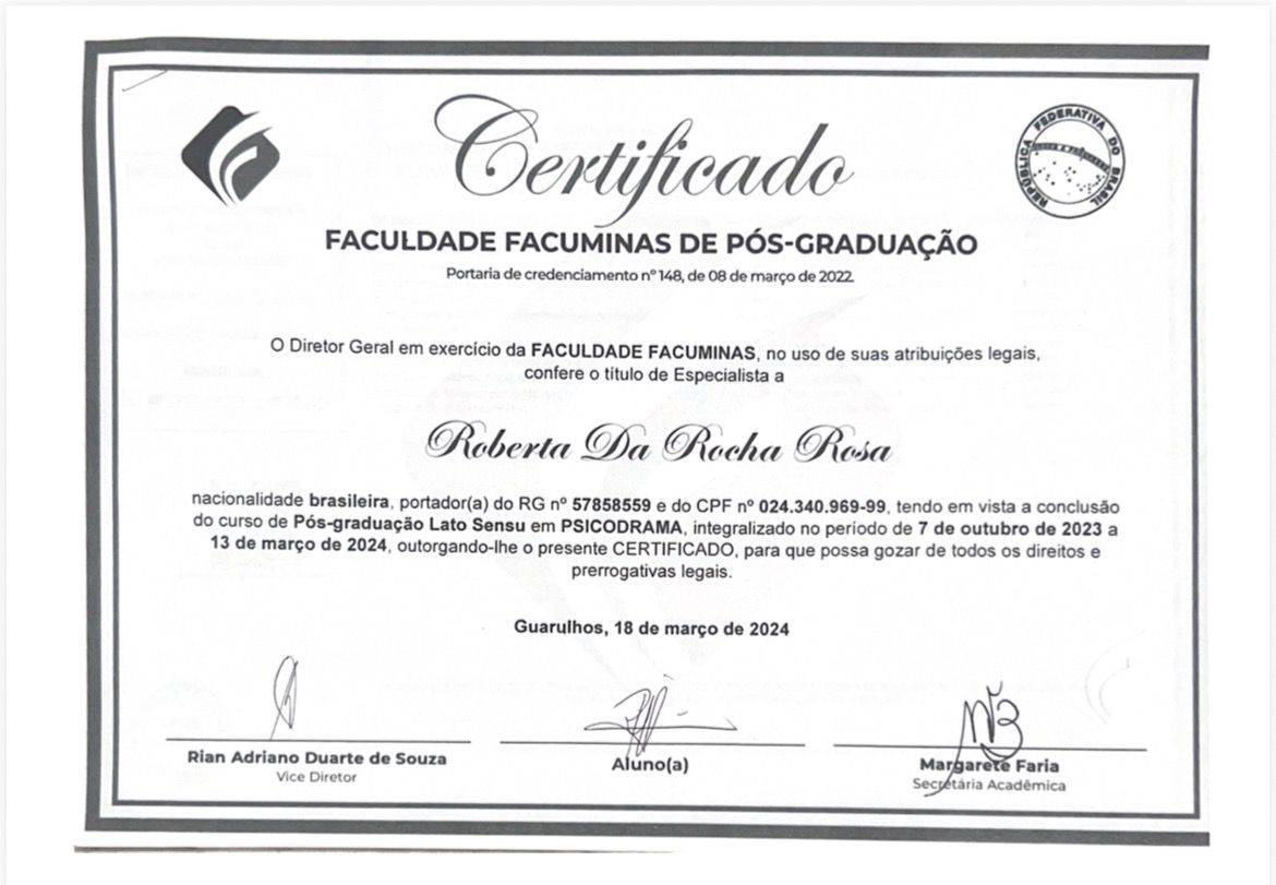 Meu nome é Roberta da Rocha Rosa, CRP 08/41064. Atuo com a abordagem sistêmica (familiar) e Teoria Cognitivo Comportamental, em todas as idades e com neurodivergências em geral, como TEA, TDAH e TOD.