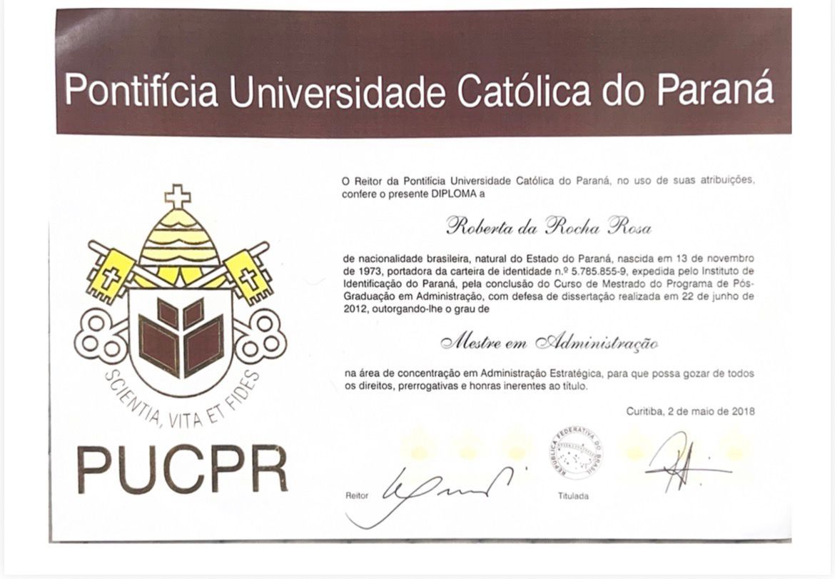 Tenho 20 pós graduações e mais quatro em andamento e sou professora da PUC/PR.