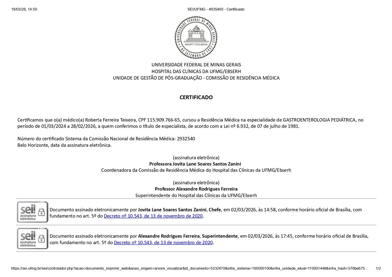 Olá! Sou Roberta, médica formada pela Faculdade Ciências Médicas de Minas Gerais. Escolhi a Pediatria como primeira área de atuação, realizando minha primeira residência médica no Hospital Infantil João Paulo II, também conhecido como CGP, durante três anos . Em seguida, optei por uma nova especialização, tendo realizado uma nova residência médica em gastroenterologia pediátrica, no Hospital das Clínicas da UFMG, com mais dois anos de duração.