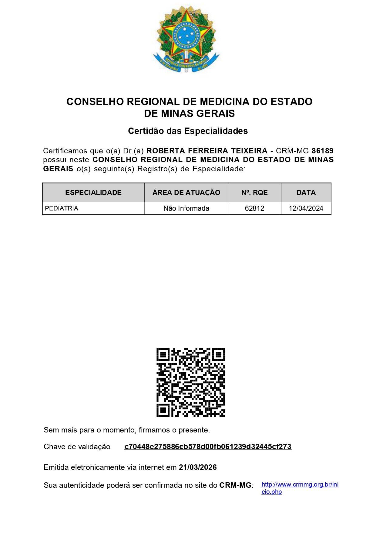 Número de registro: CRM MG 86189 RQE Não Encontrada (Gastroenterologista Pediátrica)