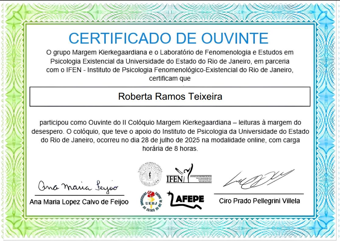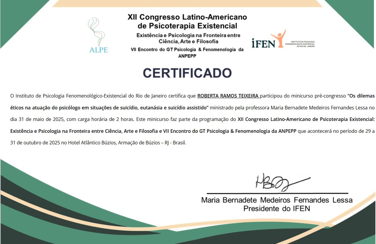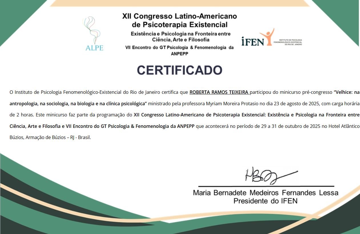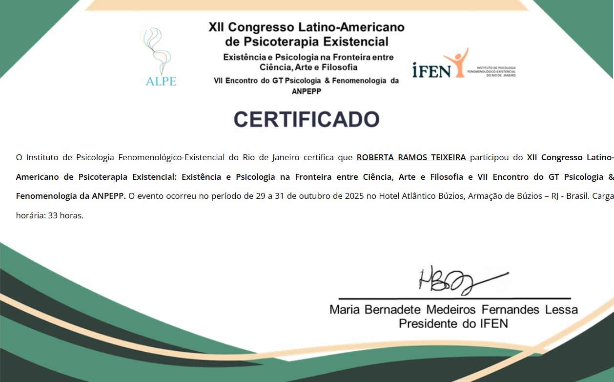 Após a graduação, me especializei em Psicologia Clínica Fenomenológico-Existencial pelo Instituto de Psicologia Fenomenológico Existencial do Rio de Janeiro – IFEN. Busco continuamente aprofundar minha formação e enriquecer minha prática clínica por meio de cursos e grupos de estudo que dialogam com a filosofia, a literatura e as questões sociais contemporâneas.