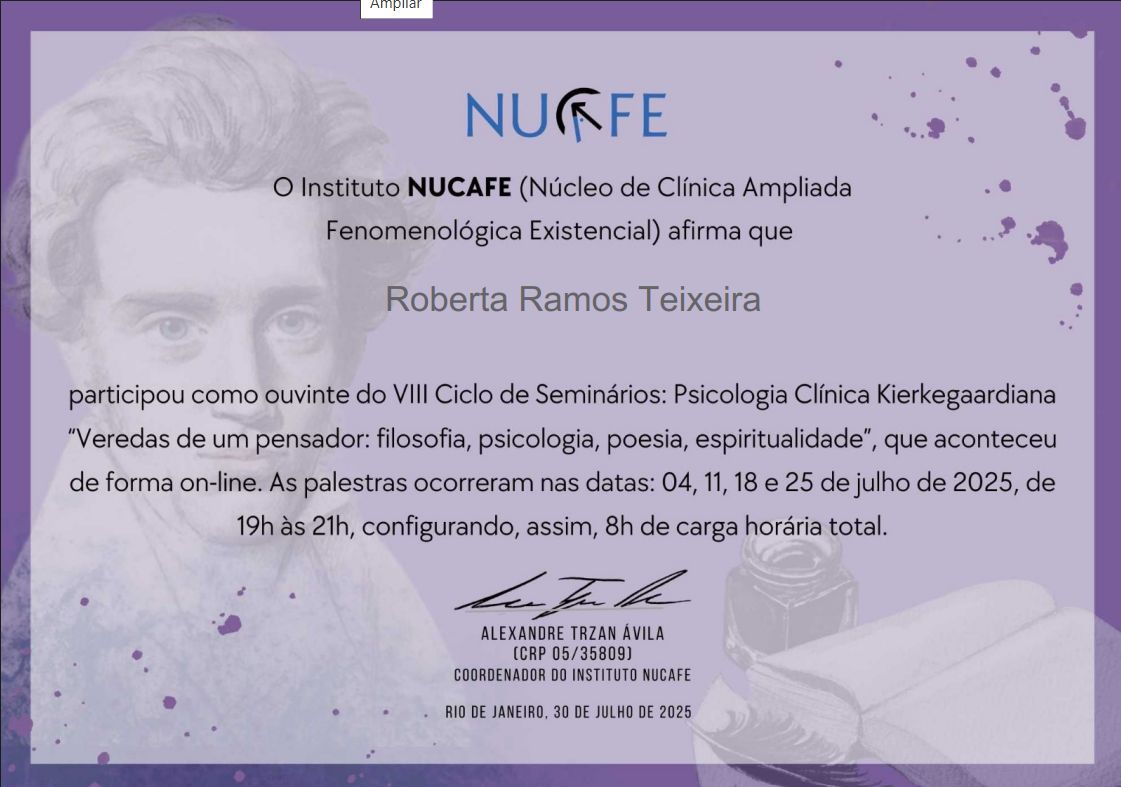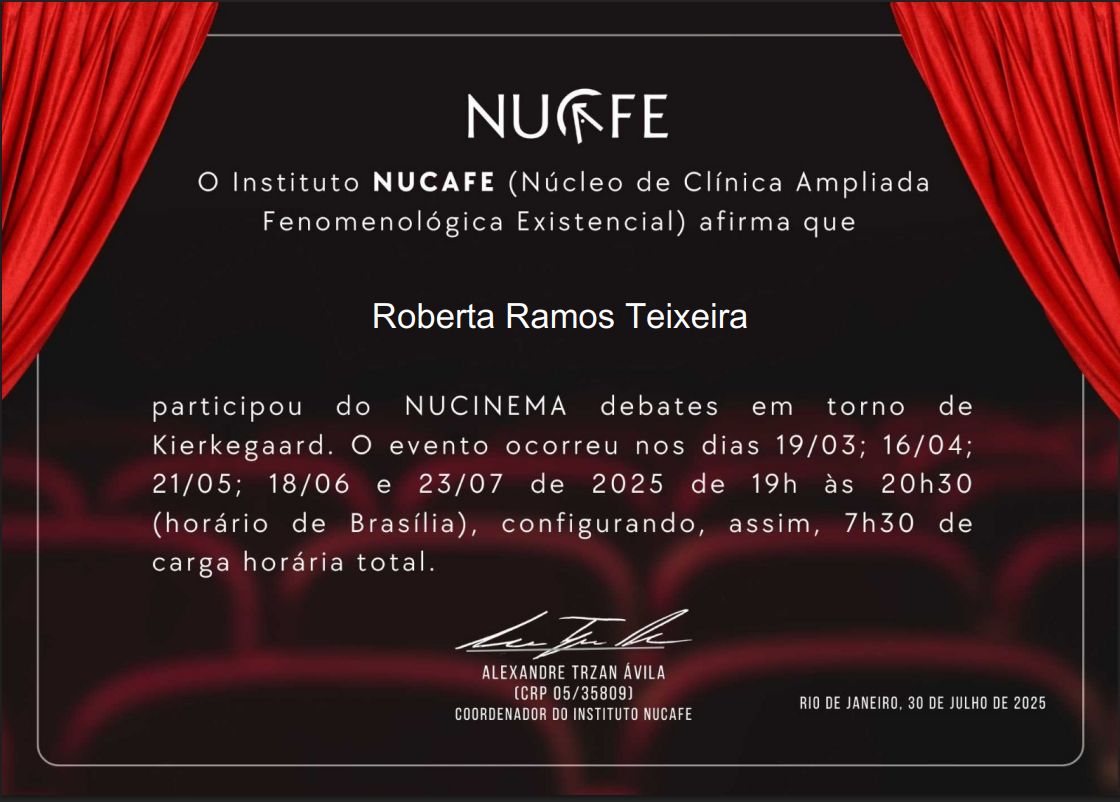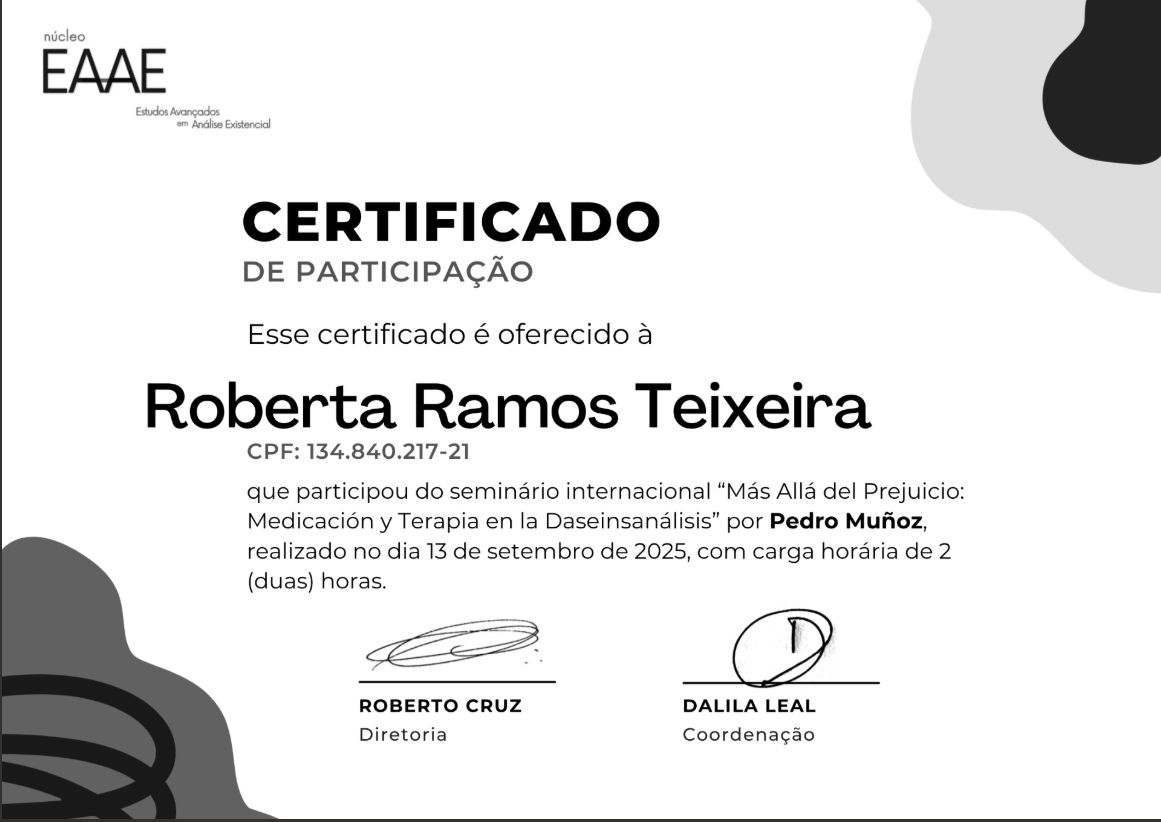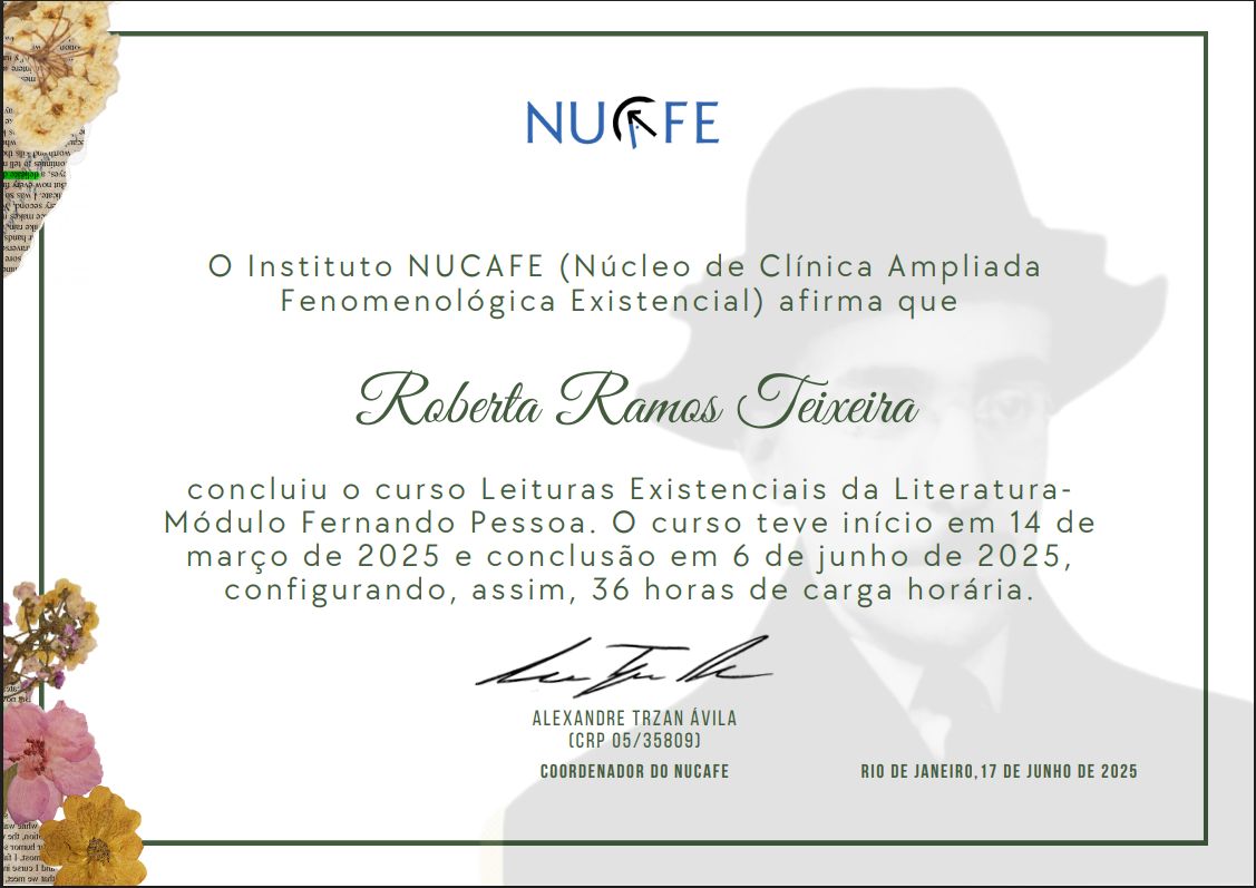 Complemento minha formação com estudos em Gestalt-Terapia, Esquizoanálise e Conduções Clínicas, além de formações voltadas às leituras existenciais da literatura, com aprofundamento nas obras de Clarice Lispector, Guimarães Rosa, Fernando Pessoa e Fiódor Dostoiévski. Esses autores ampliam meu olhar sobre o existir e contribuem diretamente para a escuta clínica, sensível às nuances da experiência. Também participo regularmente de grupos de estudos em psicologia existencial, infância, literatura, cinema e angústia. Essas vivências alimentam minha escuta e me ajudam a estar mais presente diante das histórias que chegam à clínica.