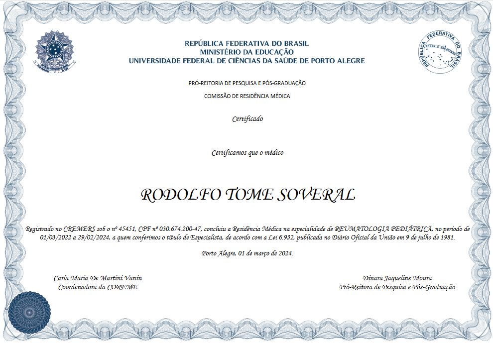 Atuo como reumatologista pediátrico no Hospital da Criança Santo Antônio, onde acompanho pacientes internados e realizo atendimentos ambulatoriais. Também sou professor de Pediatria na Unisinos e preceptor da residência médica no Hospital Moinhos de Vento. Minha missão é cuidar com dedicação da saúde das crianças, unindo conhecimento, experiência e empatia.