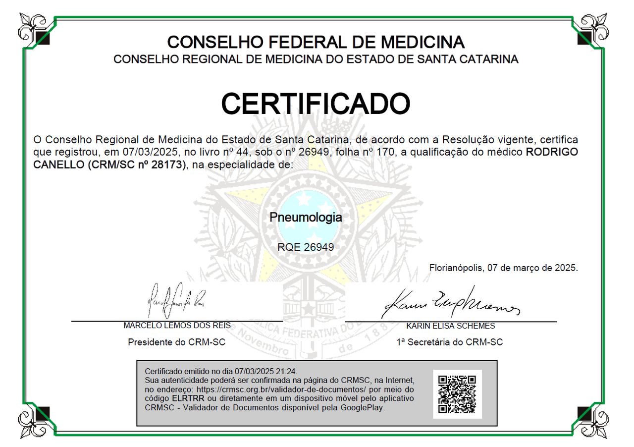 Quais são as principais especialidades de Rodrigo Canello?Rodrigo Canello é pneumologista, especialista em clínica médica, internista. Te mostramos alguns dos serviços oferecidos pelo especialista graças à sua trajetória e vasta experiência: Exame de espirometria, Provas de função pulmonar, Consulta médica, Tratamento para parar de fumar, Consulta Pneumologia, Acompanhamento de nódulo pulmonar, Tratamento de doença pulmonar obstrutiva crônica (DPOC), Tratamento de asma, Orientação da cessação do tabagismo (parar de fumar), Tratamento e investigação de falta de ar.