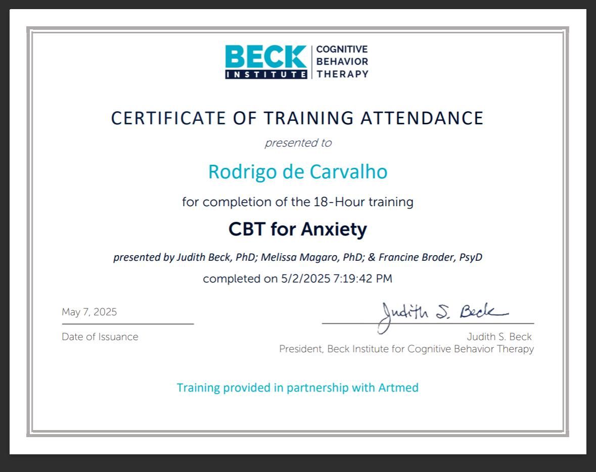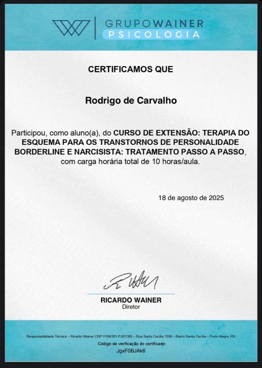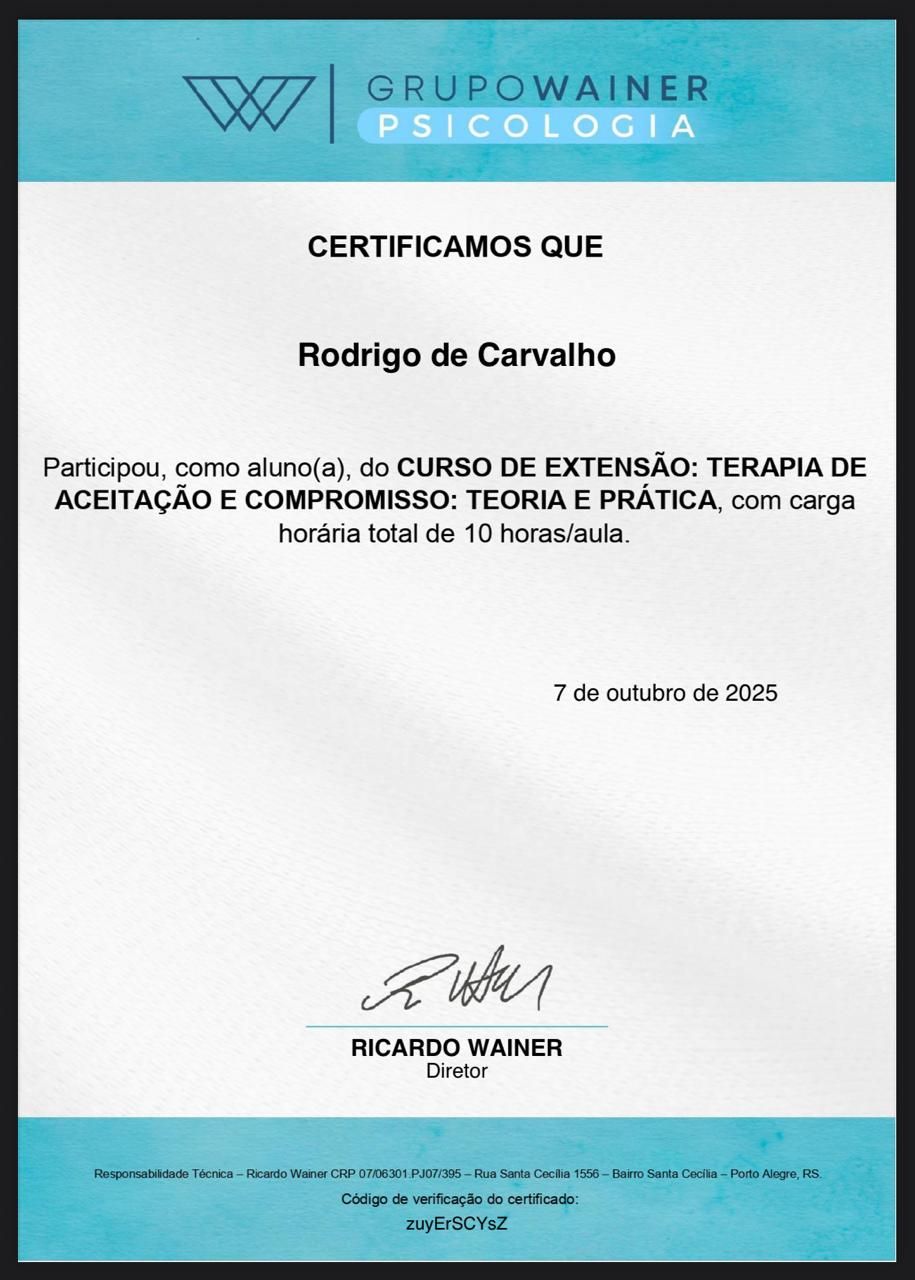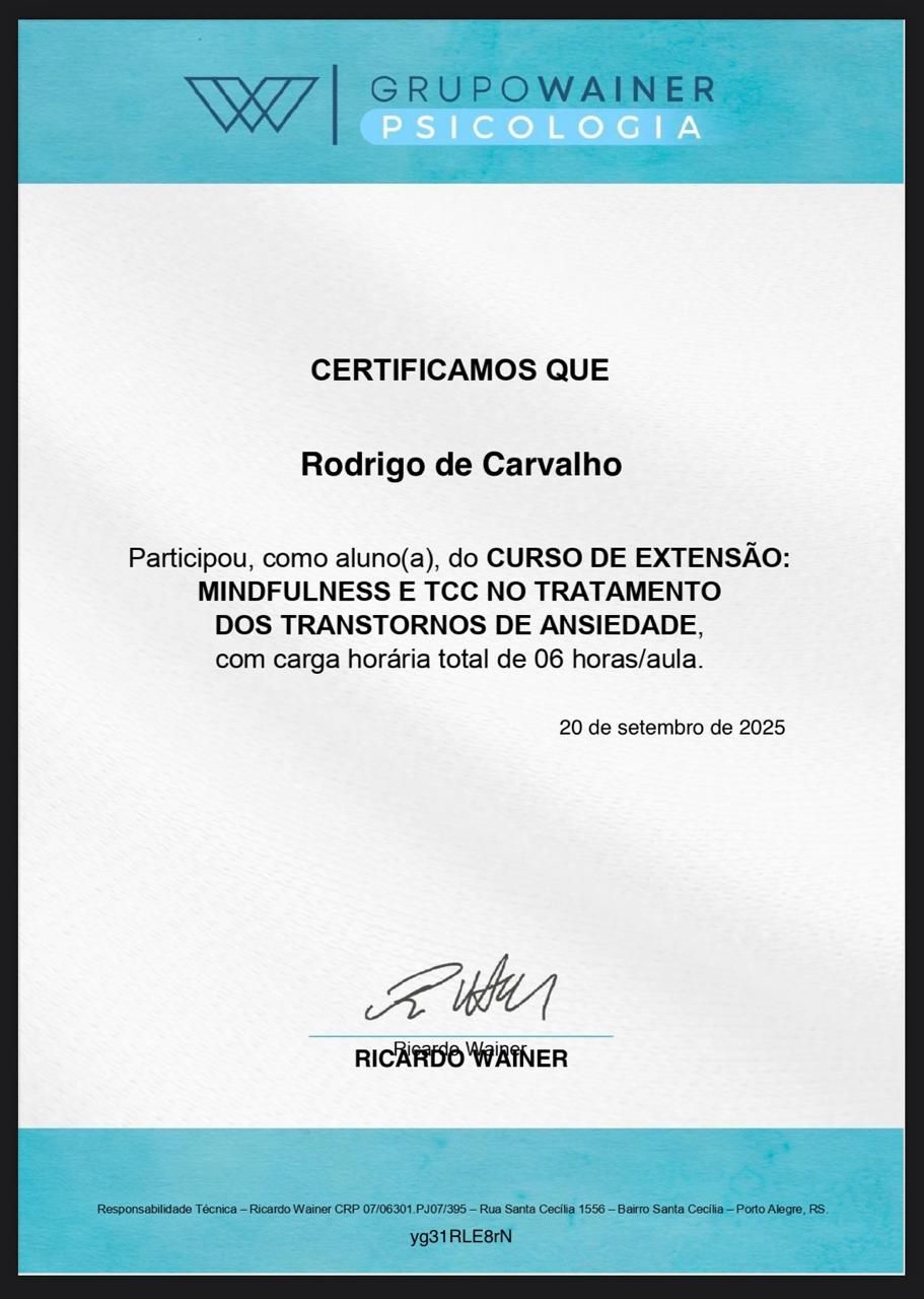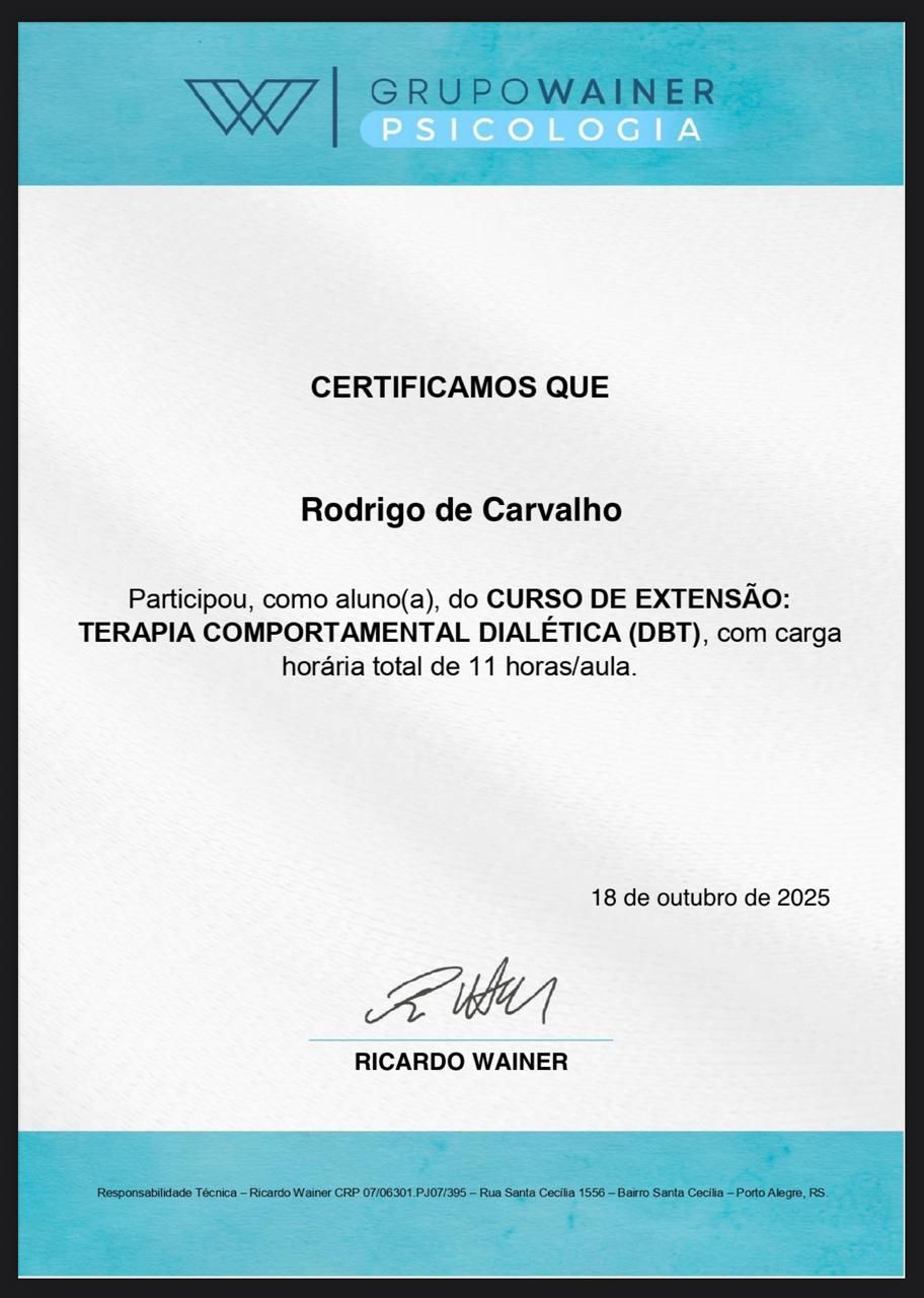 Rodrigo é um profissional incrível, fazer terapia com ele tem me ajudado muito, desde o começo me senti acolhido e à vontade para falar sobre tudo. Além de ter um conhecimento enorme, ele é muito humano, atencioso e cuidadoso no atendimento. Sou muito grato por todo o apoio e pela diferença que esse processo tem feito na minha vida.