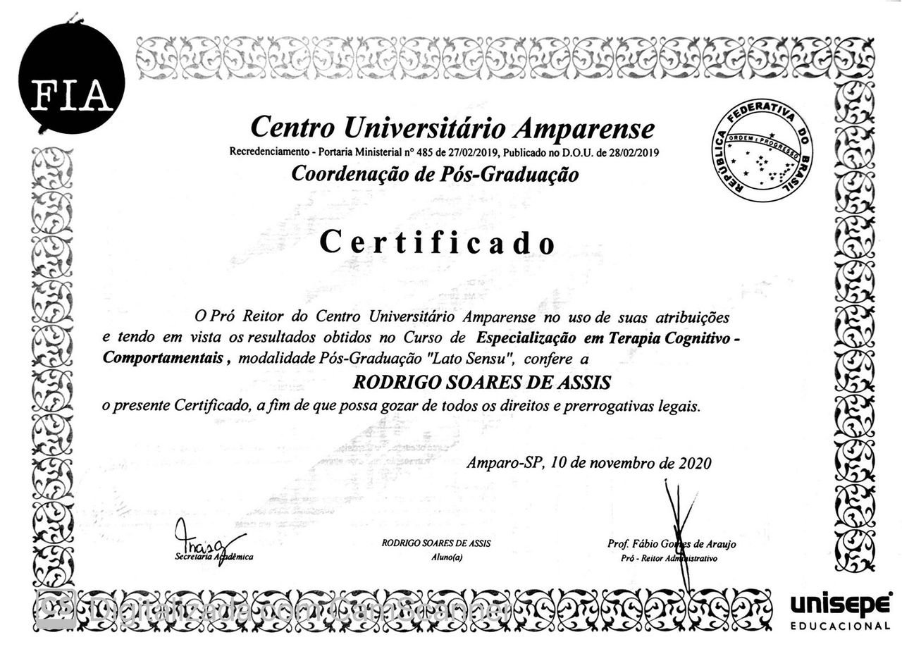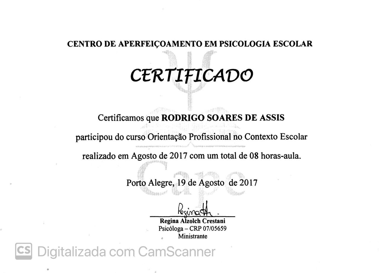 Quais são as principais especialidades de Rodrigo Soares de Assis?Rodrigo Soares de Assis é psicólogo. Te mostramos alguns dos serviços oferecidos pelo especialista graças à sua trajetória e vasta experiência: Teleconsulta, Atendimento Online em Psicoterapia, Atendimento Psicológico online para adulto, Psicoterapia online, Atendimento psicológico online, Terapia online, Consulta Psicologia, Tratamento da ansiedade, Psicoterapia adulto, Primeira consulta psicologia.