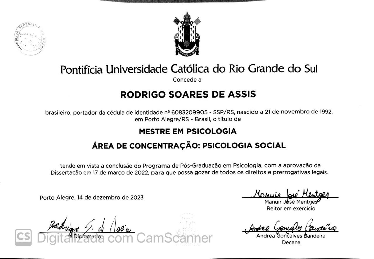 Meu nome é Rodrigo Soares de Assis, sou Psicólogo Clínico há 10 anos, formado pela PUCRS, com Especialização em Terapia Cognitivo Comportamental e Mestrado em Psicologia Social, com foco em burnout e contextos de trabalho de alta pressão. Atendo principalmente adultos que enfrentam esgotamento emocional, ansiedade e depressão. Tenho experiência clínica, acadêmica e profissional em ambientes de alta exigência, incluindo organizações e processos de recrutamento e seleção. Além disso, sou músico e possuo uma breve carreira como ator, o que contribui para uma escuta sensível a questões de identidade, performance, pressão e autocobrança.