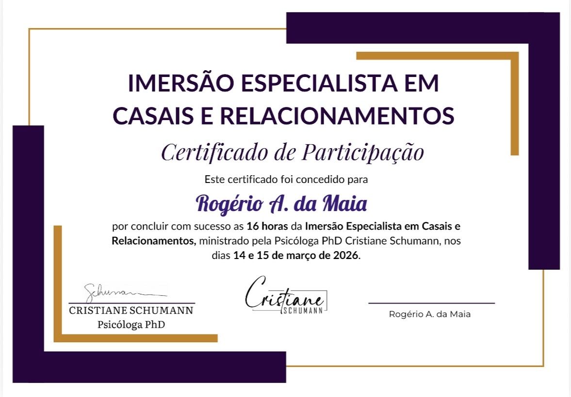 Eu e meu parceiro tivemos uma experiência extremamente positiva. Desde o início, nos sentimos acolhidos, escutados e respeitados em nossas individualidades e também enquanto casal. Dr Rogerio conduziu a sessão com clareza e muita ética, criando um espaço seguro para que ambos pudéssemos falar sem medo de julgamento. Mesmo sendo o primeiro encontro, saímos com a sensação de organização emocional, compreensão do que nos trouxe até ali e esperança de que estamos no caminho certo.