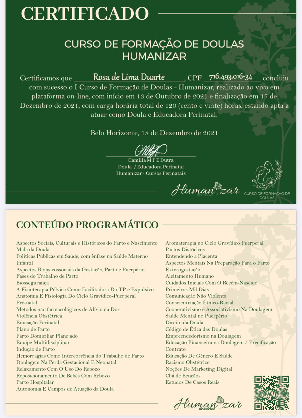 Sou a Rosa de Lima Duarte, Doula e Educadora Perinatal, oferecendo instrução e cuidados personalizados durante a gravidez, parto e puerpério.