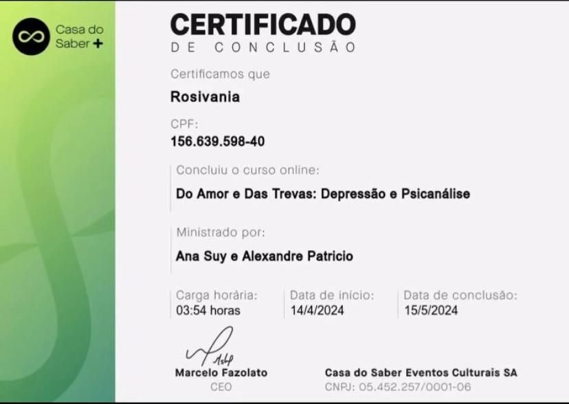 Rosivania é muito estudiosa, têm uma escuta atenta e empática. Foi muito cordial desde o primeiro contato. Ambiente acolhedor e lindo! Estou encantada com sua didática e profissionalismo. Que gostoso cuidar da nossa mente com uma pessoa tão especial.