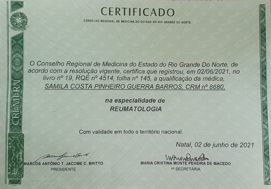 - Especialista pela Sociedade Brasileira de Reumatologia (SBR).