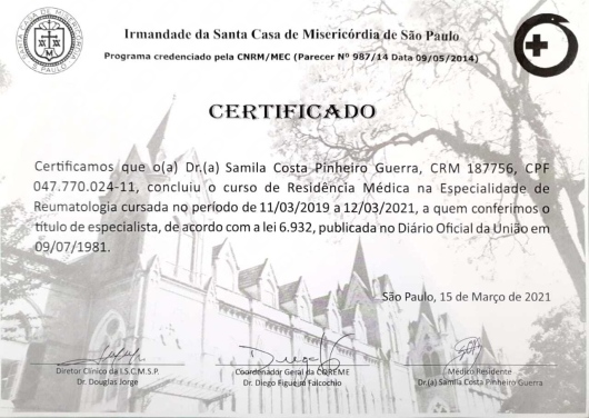 - Residência em Reumatologia pela Santa Casa de São Paulo (ISCMSP)