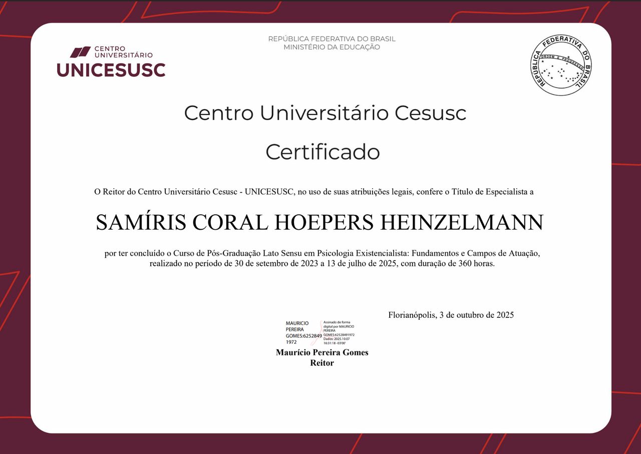 Sou Samíris, psicóloga formada pela UFSC e especialista em Psicologia Existencialista pela Unicesusc. Meu trabalho é guiado por essa abordagem, que entende a vida como um constante processo de construção de sentido, liberdade e responsabilidade.
