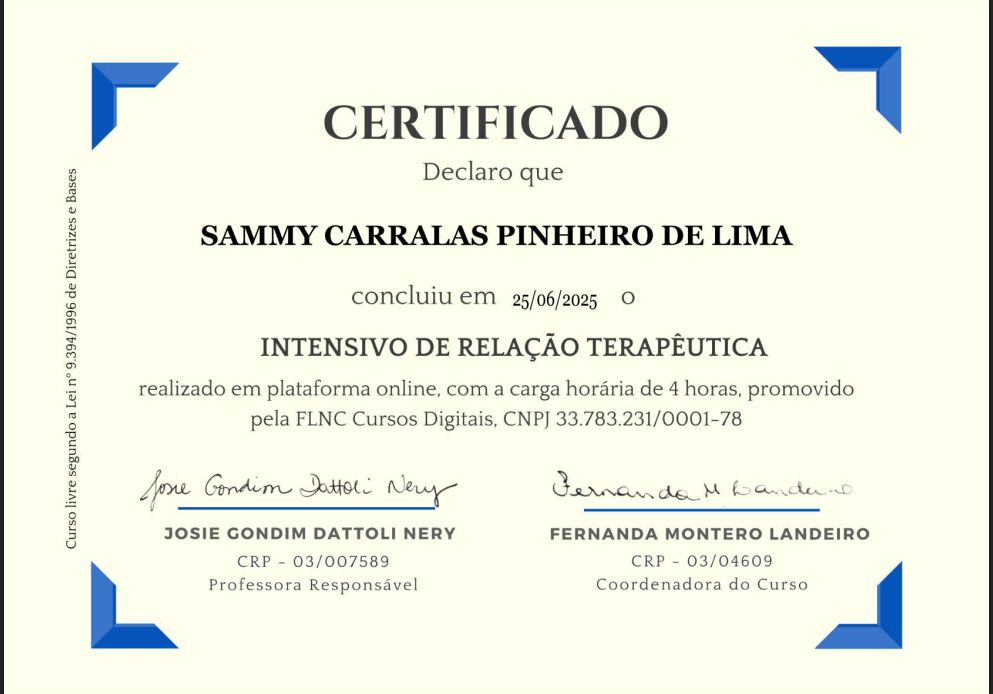 Sammy me ouviu e me acolheu, explicou tudo bem certinho. Foi minha primeira sessão, acredito que juntas vou conseguir progredir com minhas questões