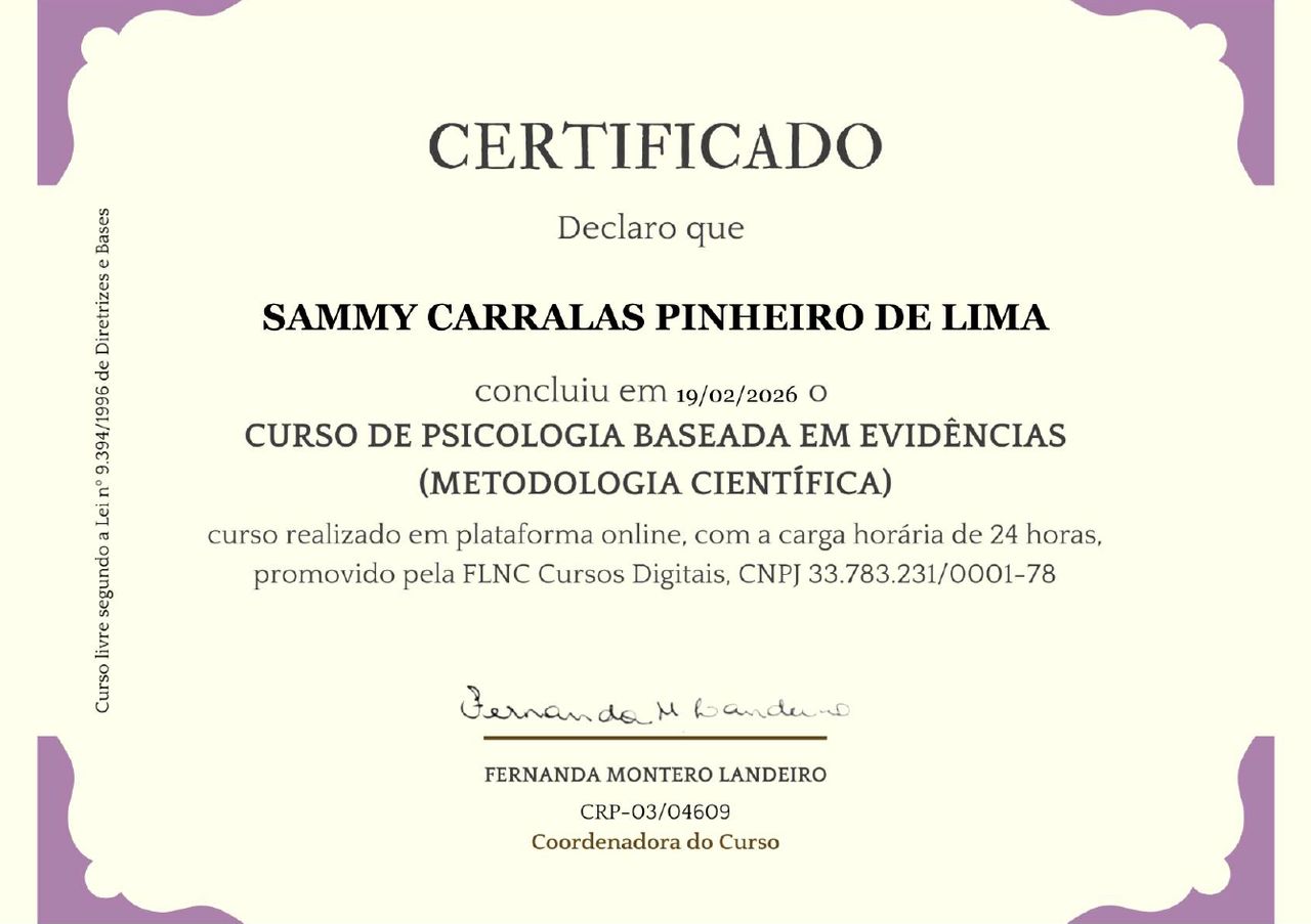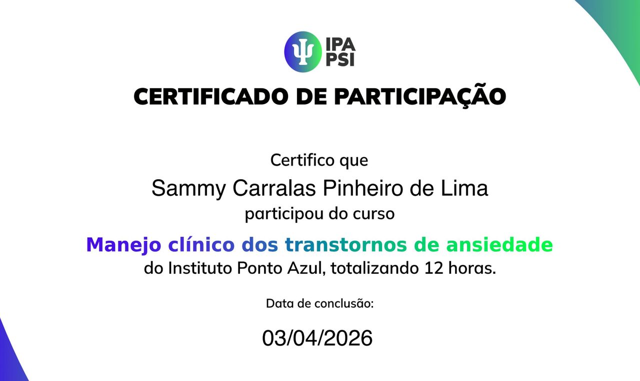 Olá, sou Sammy Carralas, psicóloga especializada em Terapia Cognitivo-Comportamental (TCC) e Terapia de Aceitação e Compromisso (ACT). Atendo adultos que se sentem constantemente sobrecarregados, cansados de tentar “dar conta” de tudo e com a sensação de que a vida exige mais do que conseguem entregar.