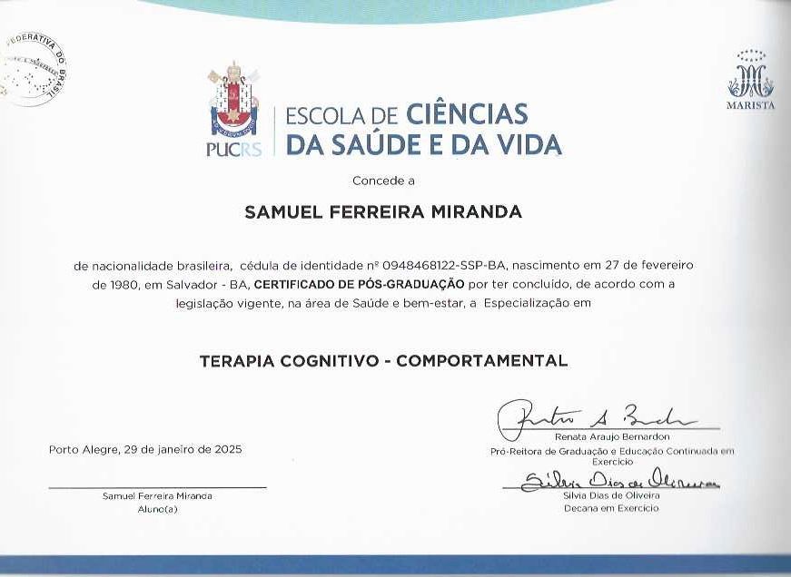 Sou pós-graduado em Terapia Cognitivo-Comportamental pela PUC-RS e possuo formação complementar em DBT (Terapia Comportamental Dialética), ACT (Terapia de Aceitação e Compromisso) e Terapia do Esquema. Essas abordagens ampliam minha prática clínica e me permitem trabalhar de forma profunda com padrões emocionais, comportamentos repetitivos e dificuldades nos relacionamentos.