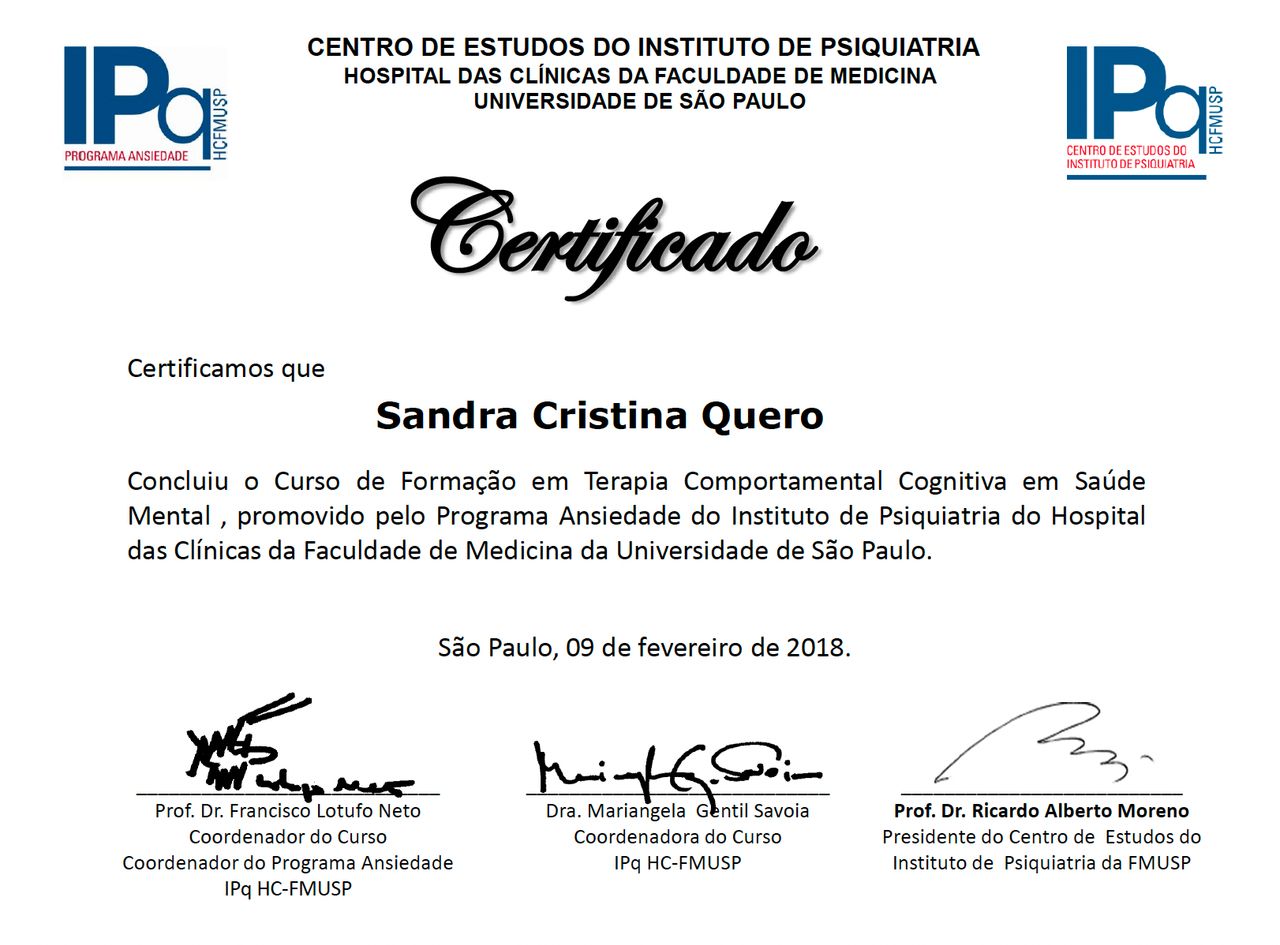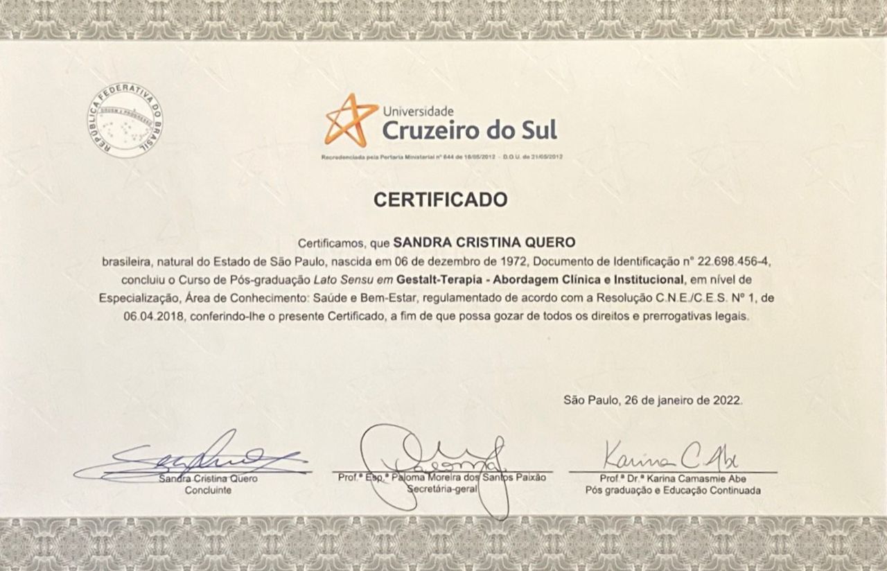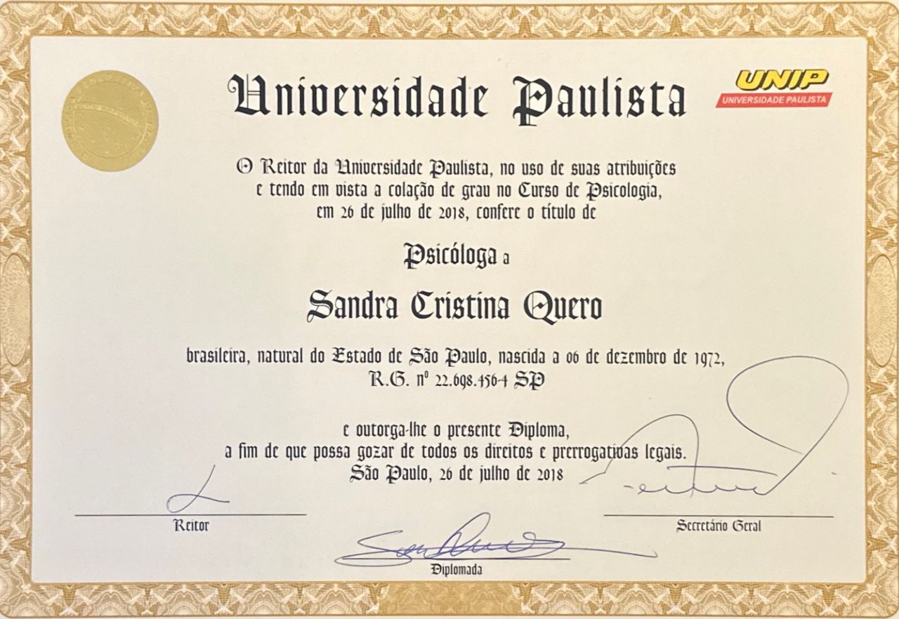 Psicologa (CRP 06/146095), especialista clínica, gestalt-terapeuta, terapeuta dialética-comportamental (DBT), facilitadora de processos grupais (SBDG), formação em psicoterapia para adultos neurodivergentes, facilitadora de Mindfulness para Saúde e Estresse e , estudo desenvolvimento humano e psicologia há mais de 18 anos e quanto mais estudo, descubro que mais preciso estudar. Como sou uma curiosa nata, já participei de pesquisas na área de comportamento humano no Instituto de Psicologia da USP e participo como pesquisadora voluntária no Ambulatório de Ansiedade e Transtorno de Estresse Pós-Traumático (AMBAN-TEPT) do Instituto de Psiquiatria da USP (IPq-FMUSP), no qual fiz formação também.