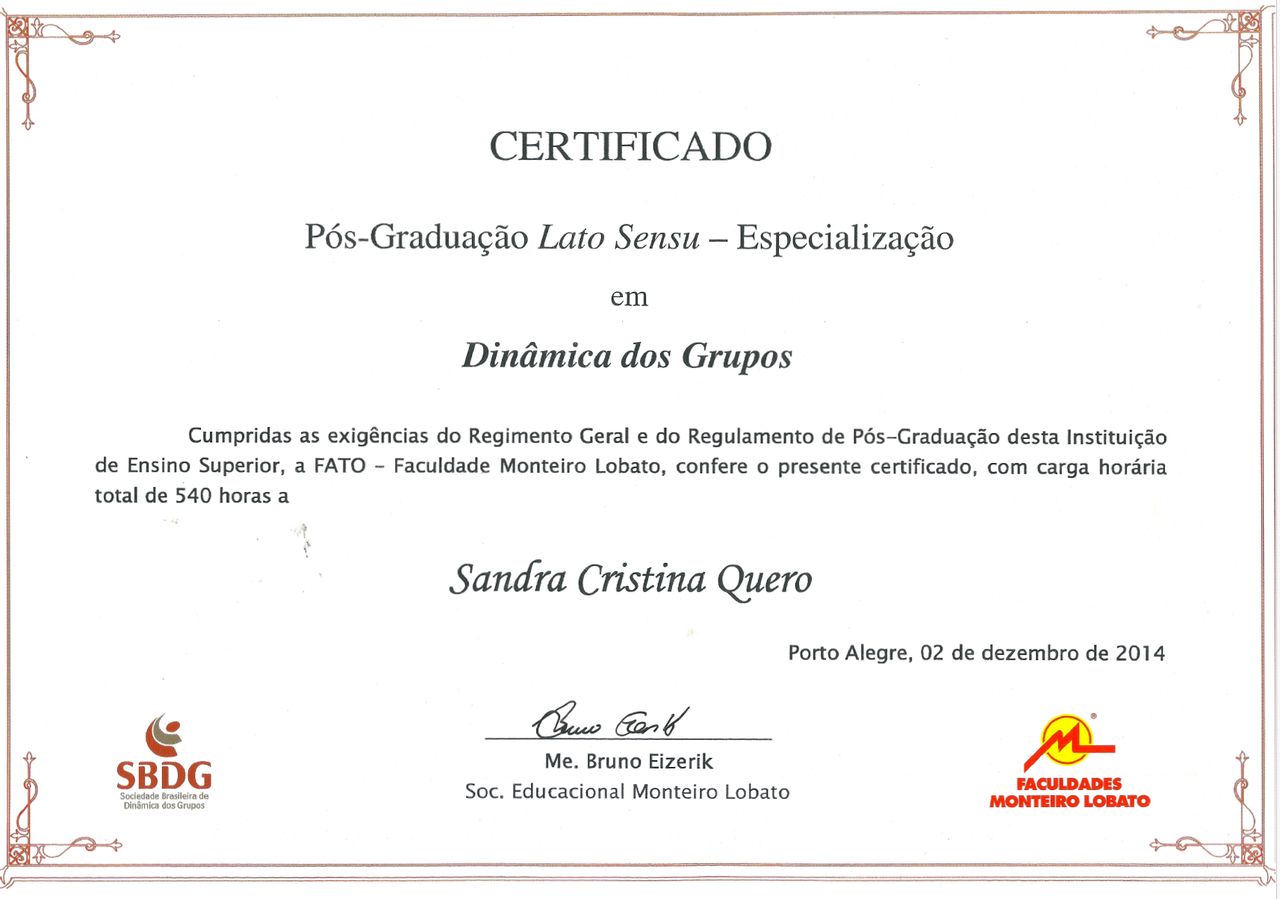 Complementam minha formação, curso de Consultoria em Desenvolvimento de Indivíduos e Organizações a partir dos princípios e conceitos da antroposofia, NPI-Netherlands Pedagogish Institute da Holanda, pela Adigo Consultores; Master em Programação Neurolinguistica pela NLPU University California/PAHC e o MBA Executivo pela Fundação Dom Cabral (FDC).