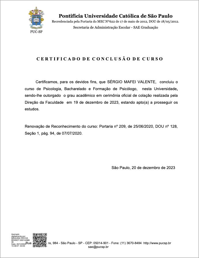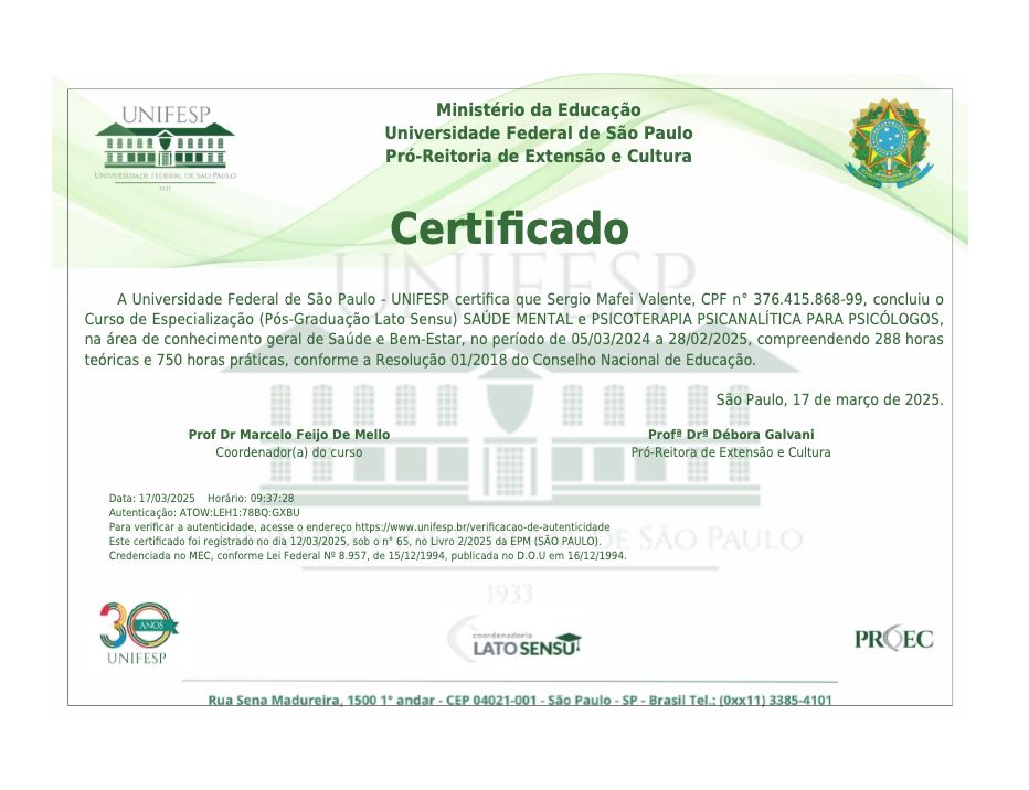 Sou psicólogo clínico formado pela PUC-SP e pós-graduado em saúde mental e psicoterapia psicanalítica pela Universidade Federal de São Paulo, com ampla experiência de atendimentos em clínicas, hospitais públicos e escolas das redes de ensino particular e pública.