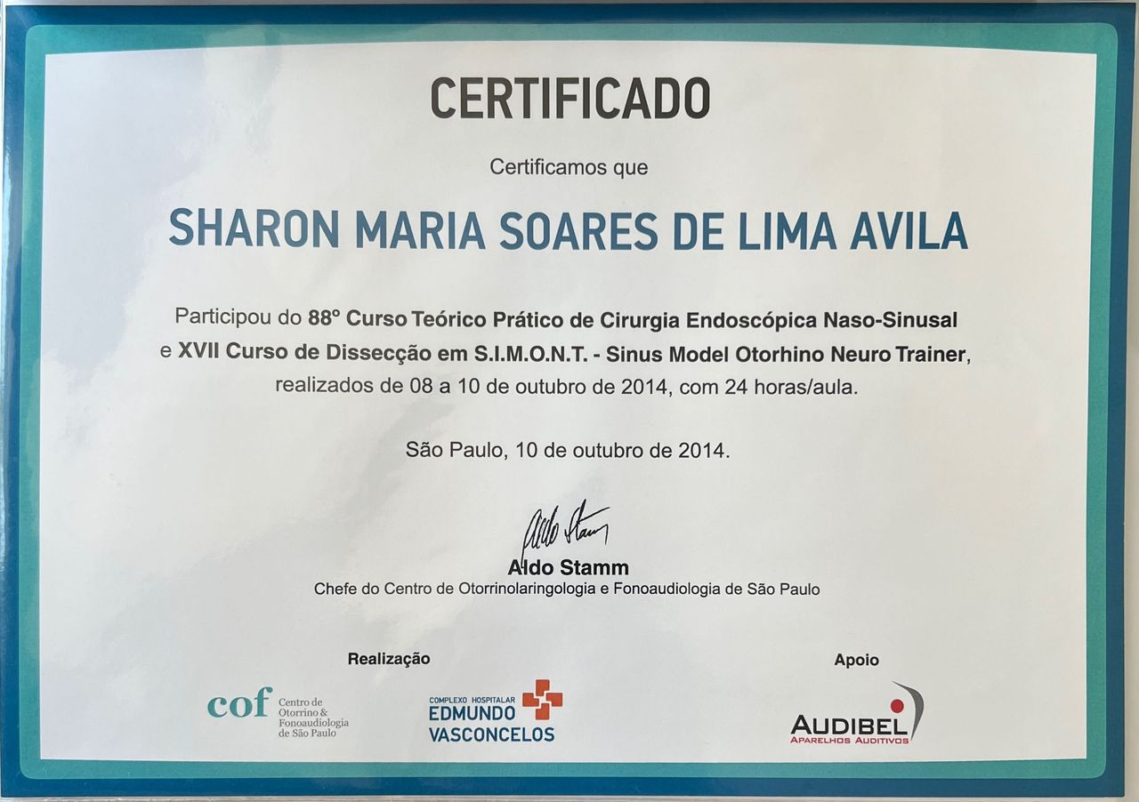 Quais são as principais especialidades de Sharon M Soares De Lima Avila?Sharon M Soares De Lima Avila é otorrino. Te mostramos alguns dos serviços oferecidos pelo especialista graças à sua trajetória e vasta experiência: Primeira consulta Otorrinolaringologia, Amigdalectomia Com Ou Sem Adenoidectomia, Adenoidectomia, Amigdalectomia, Amigdalectomia e adenoidectomia com deformidade craniofacial, Aspiração de ouvido, Atendimento Crianças e Adultos, Avaliação - dificuldades de aprendizagem, Avaliação para cirurgia de problemas de garganta, Avaliação para cirurgia do nariz ou dos seios da face.