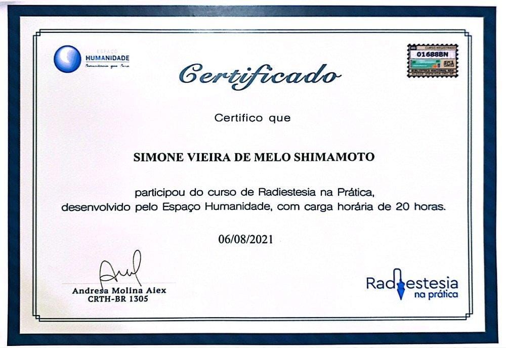 Ela é uma pessoa que tem muita empatia com o outro. As sugestões que ela faz durante às consultas traz resultados significativos e duradouros. Sobre a mesa de radiestesia o resultado é impressionante, tive provas disso através do meu irmão, que a Simone nem conheceu, e fez a mesa a distância com autorização dele e, em quatro meses a vida dele mudou completamente: parou de beber, está fazendo exercícios, emagreceu e está trabalhando normalmente. E com o trabalho da mesa de Radiestesia e com as nossas conversas, às mudanças na minha vida foram impressionantes; mudei o meu ramo de trabalho, estou conseguindo administrar os desafios com o meu trabalho, minha filha e o meu marido. Com o acompanhamento da Simone estou conseguindo equilibrar todos os setores da minha vida! A minha mensagem para Simone é Gratidão!