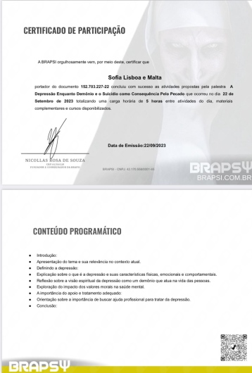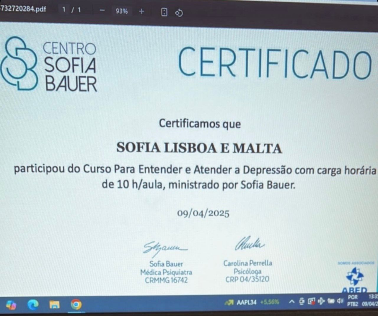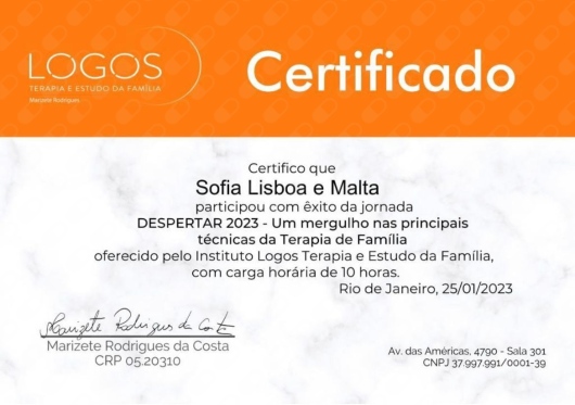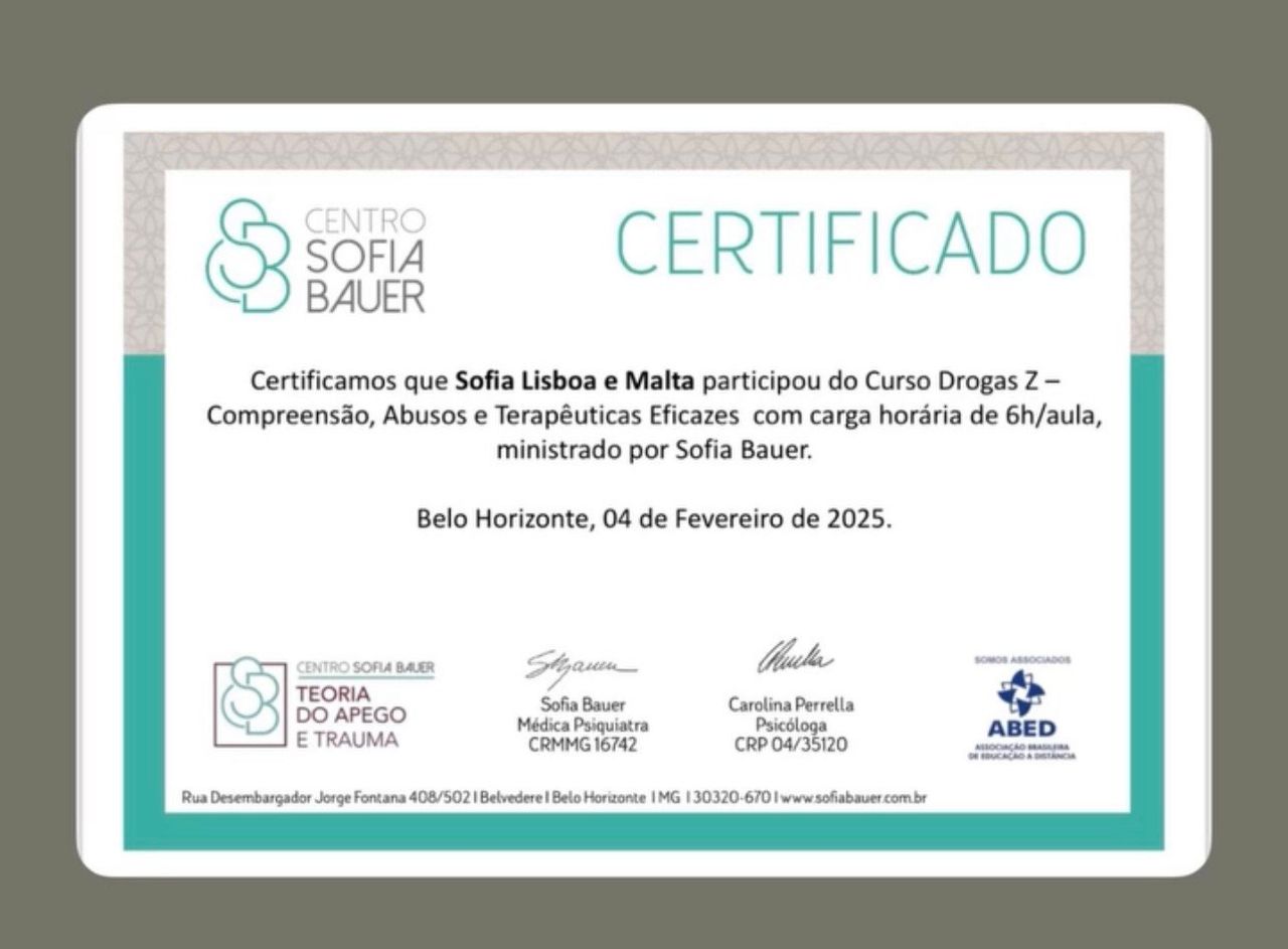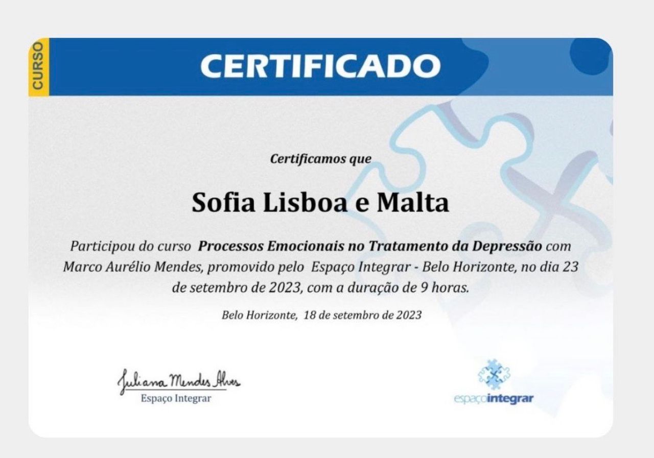 Bem como ja havia dito eu sempre pensei que terapia psicóloga era coisa de malucos, bem aqui estou eu a morder a minha língua, nunca pensei que uma terapia me deixasse tão organizada nas minhas ideias, tao leve e sobretudo disposta a enfrentar os meus bloqueios, graças a Sofia eu tenho isso tudo mesmo com essa distância e sempre online . Agradeço desde ja a psi Sofia pela paciência pela forma doce em como ela esta ali ouvir e traçar metas para eu conseguir ultrapassar esta minha fase um muito obrigada sofia.
